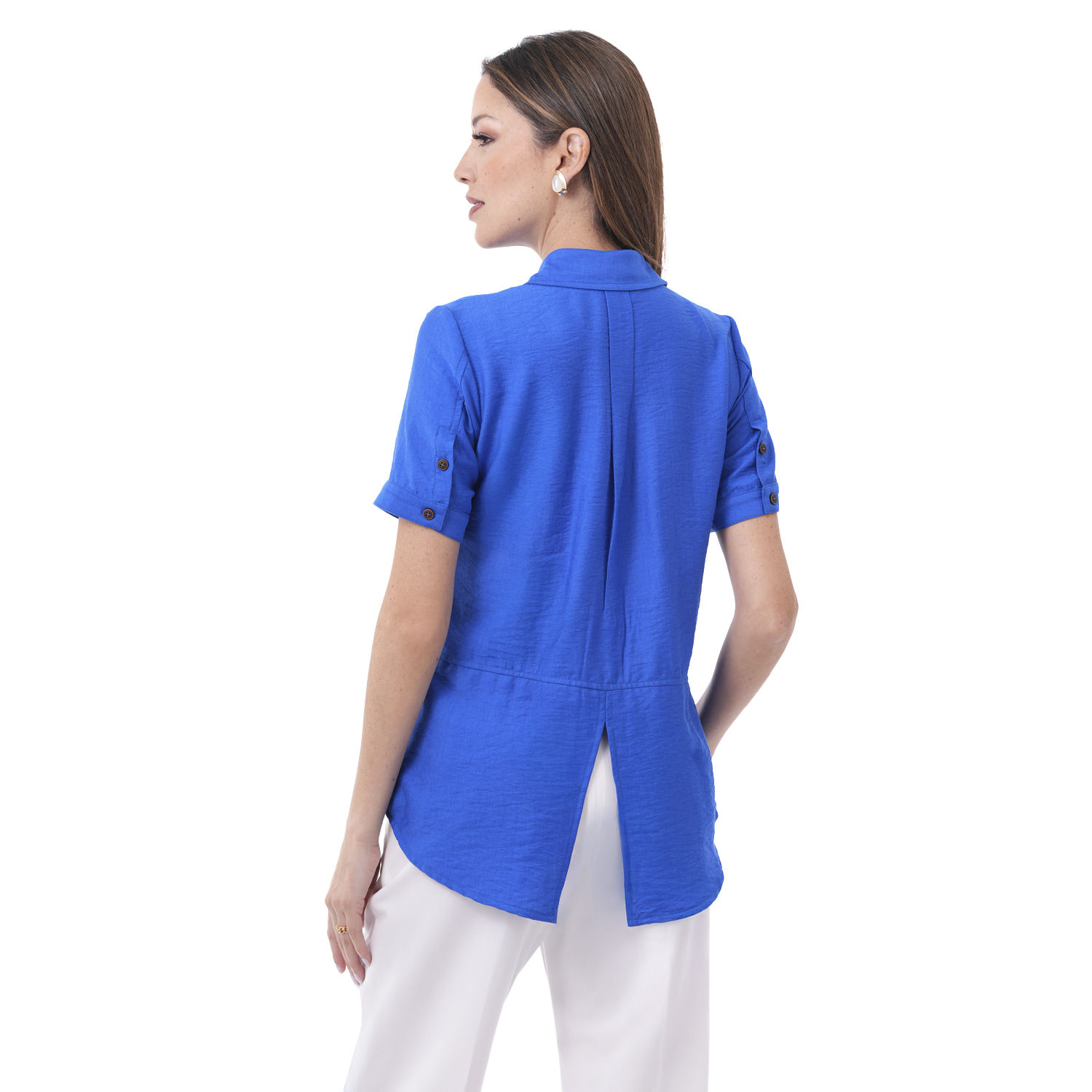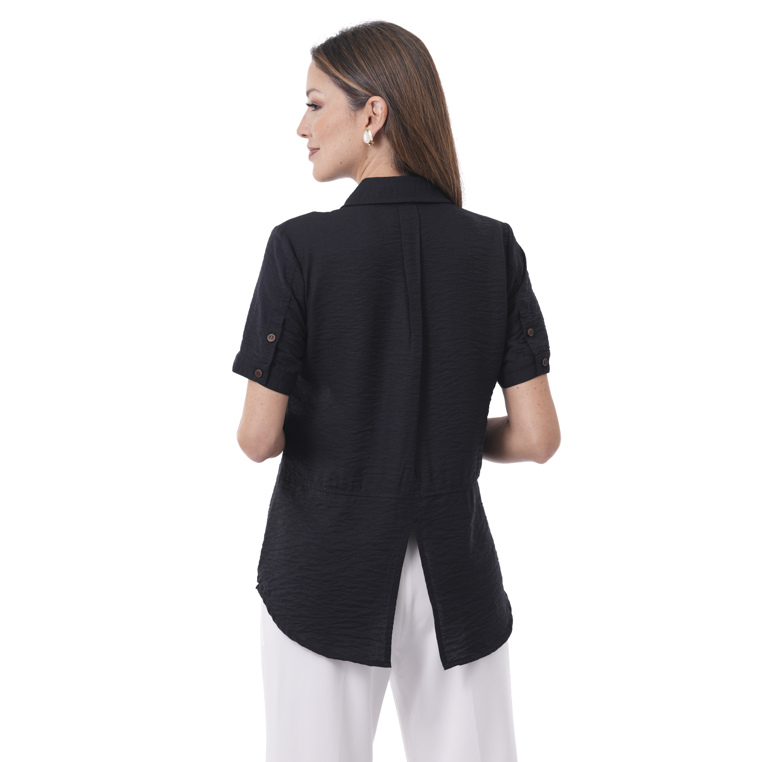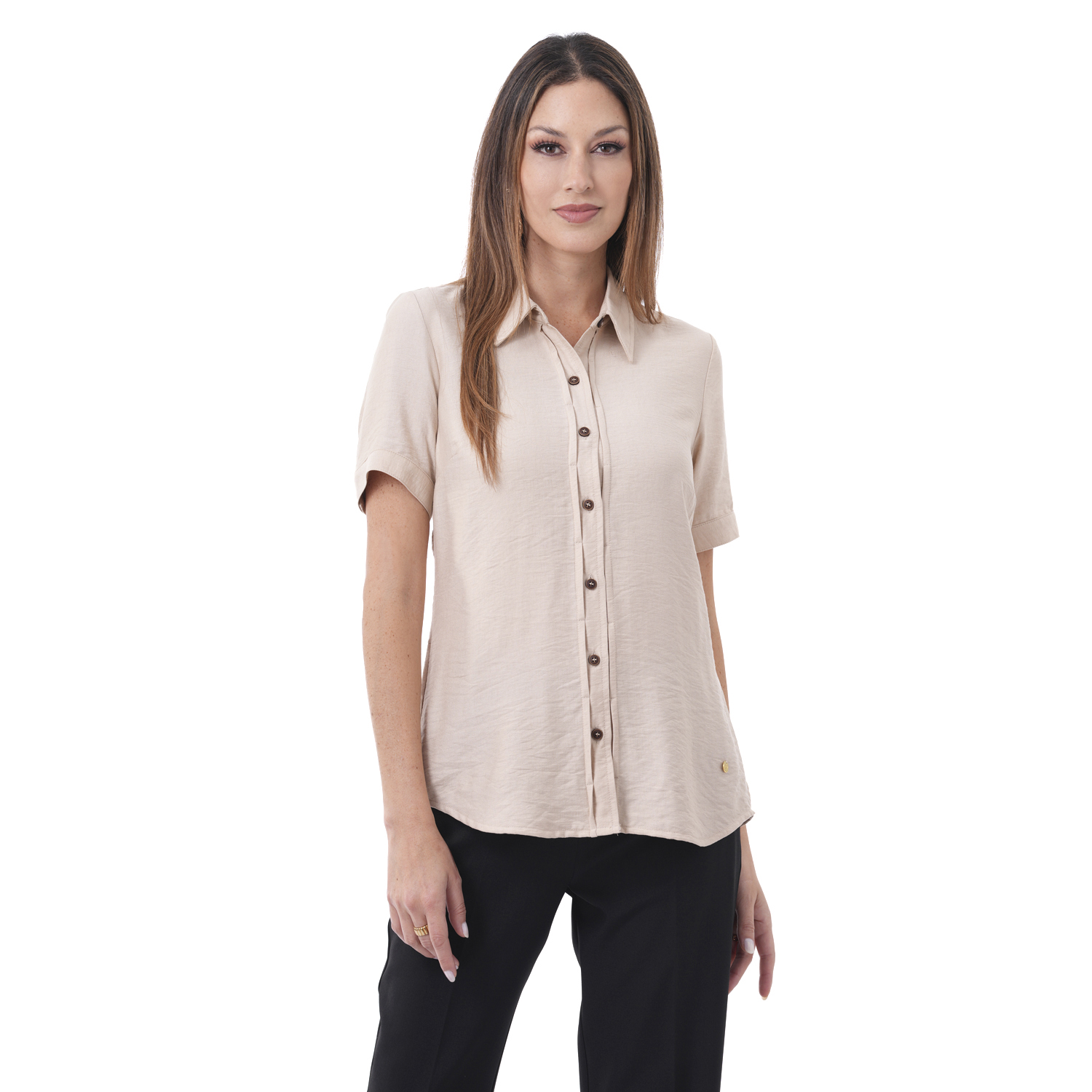 Esta blusa de manga corta y color entero destaca por su diseño limpio y sofisticado. Su silueta elegante y versátil la convierte en una prenda ideal para crear conjuntos modernos con un acabado versátil.