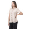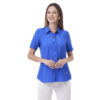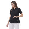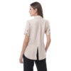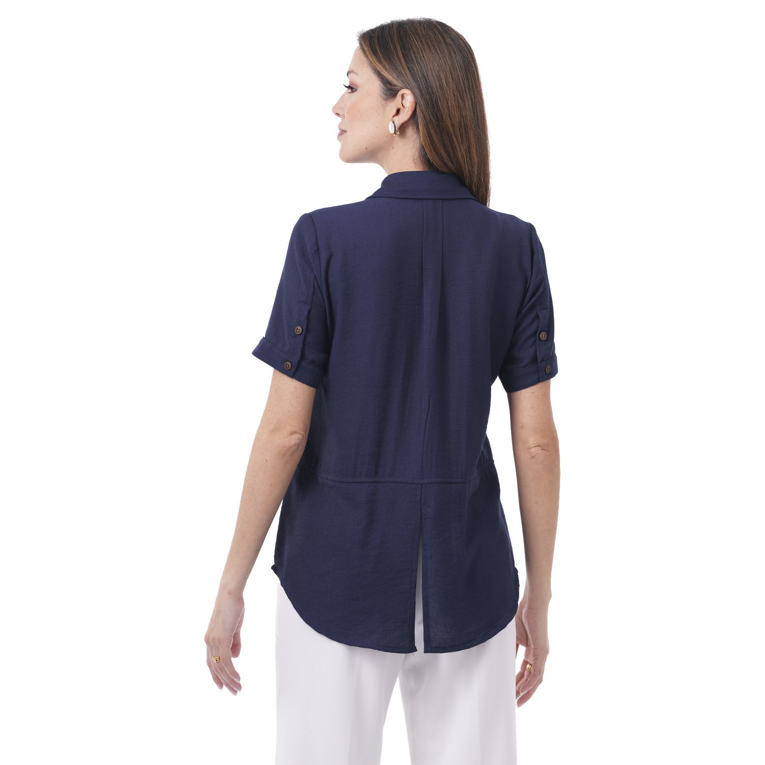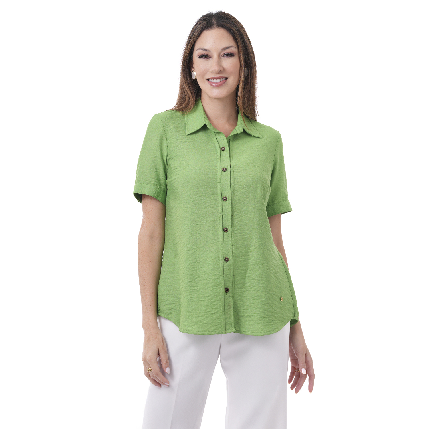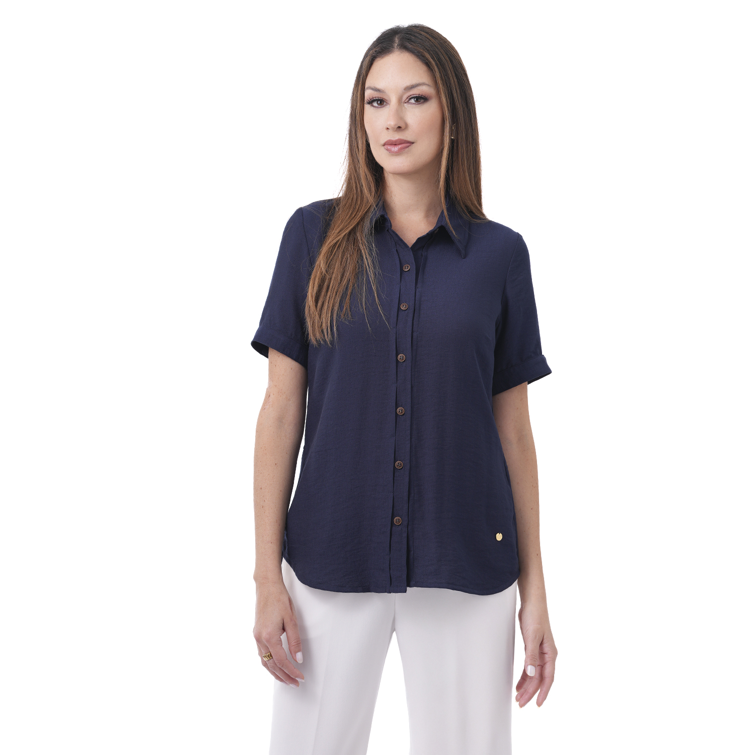 Esta blusa de manga corta y color entero destaca por su diseño limpio y sofisticado. Su silueta elegante y versátil la convierte en una prenda ideal para crear conjuntos modernos con un acabado versátil.