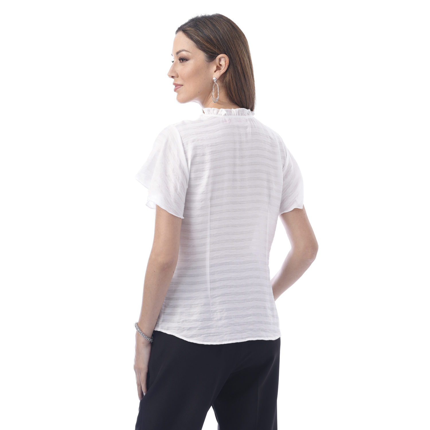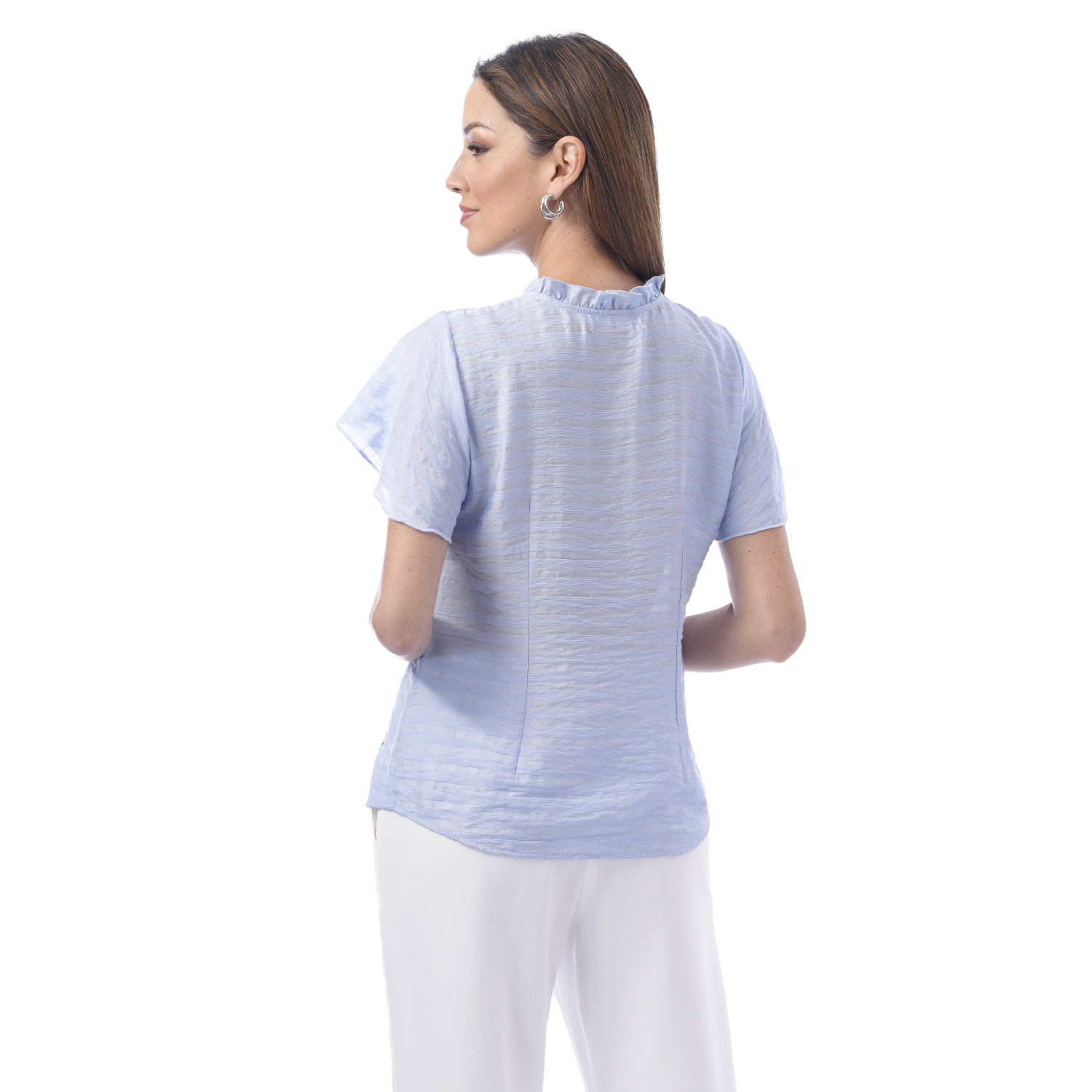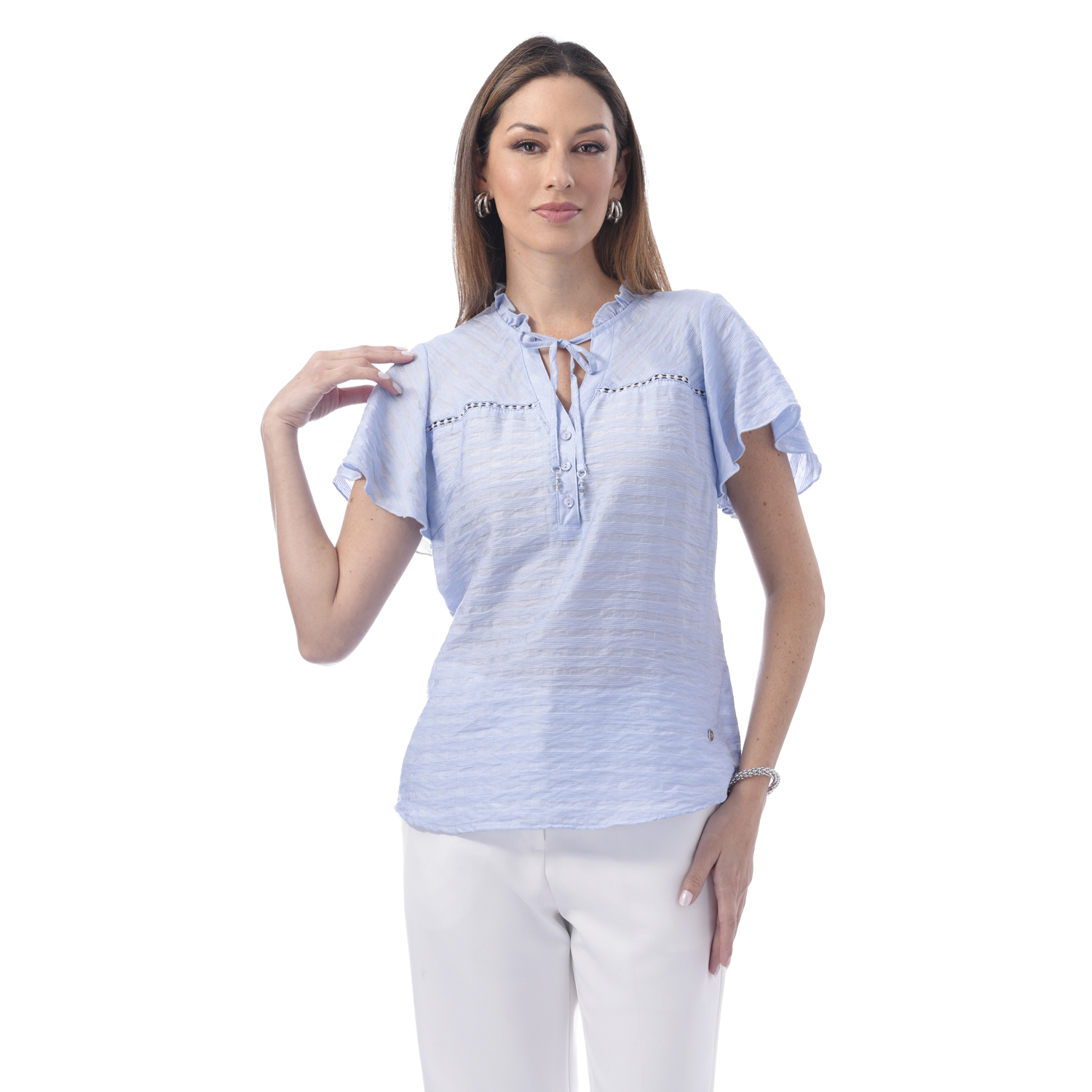 Esta blusa de color entero y manga corta ancha destaca por sus delicados detalles en el cuello que aportan un aire moderno. Su diseño la convierte en una pieza ideal para elevar looks versátiles.