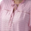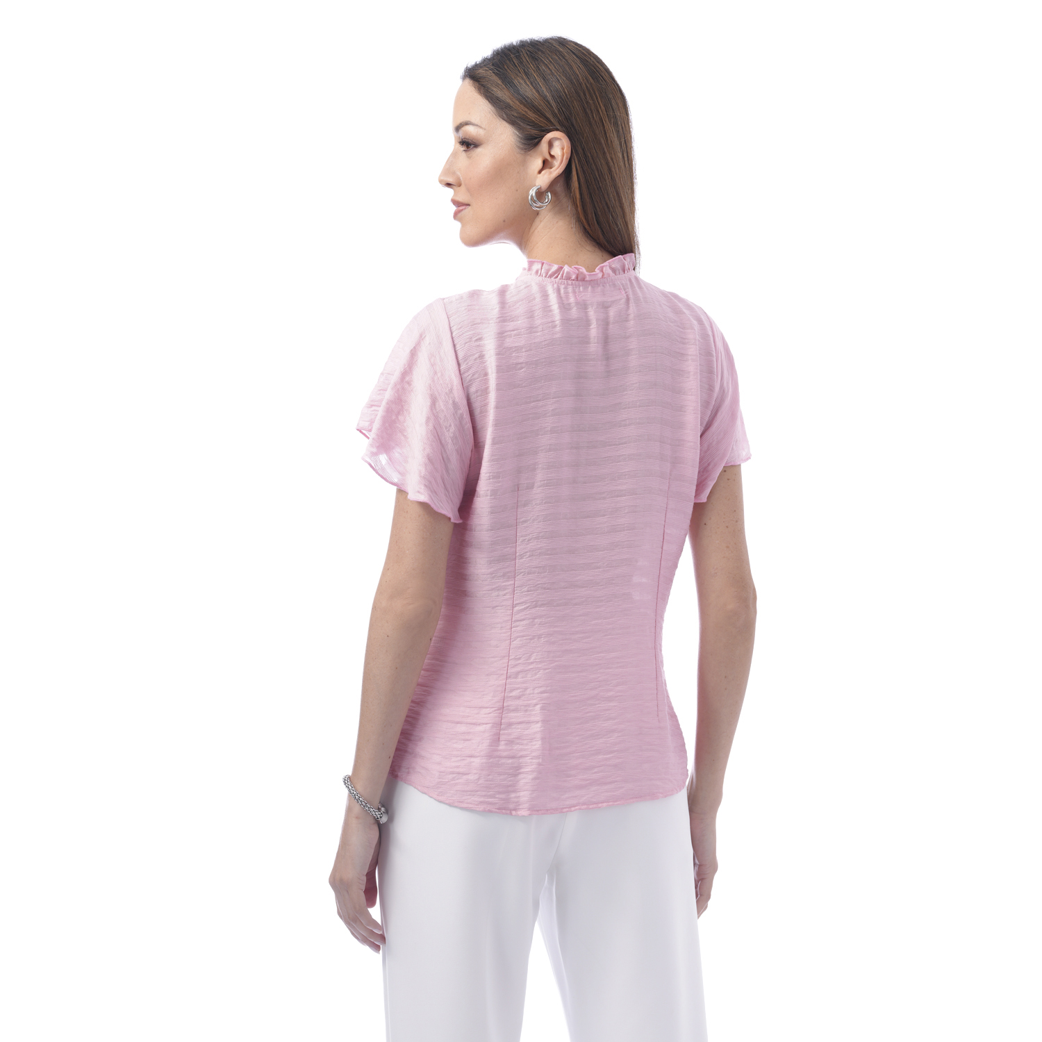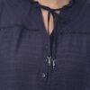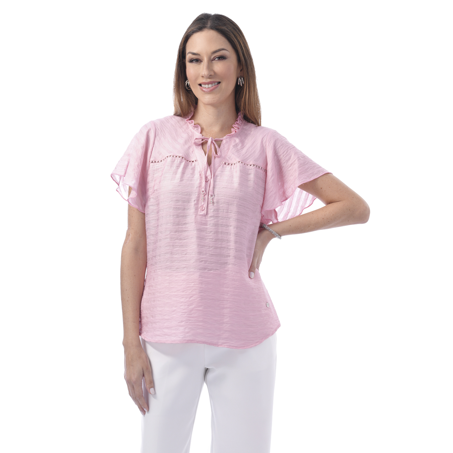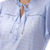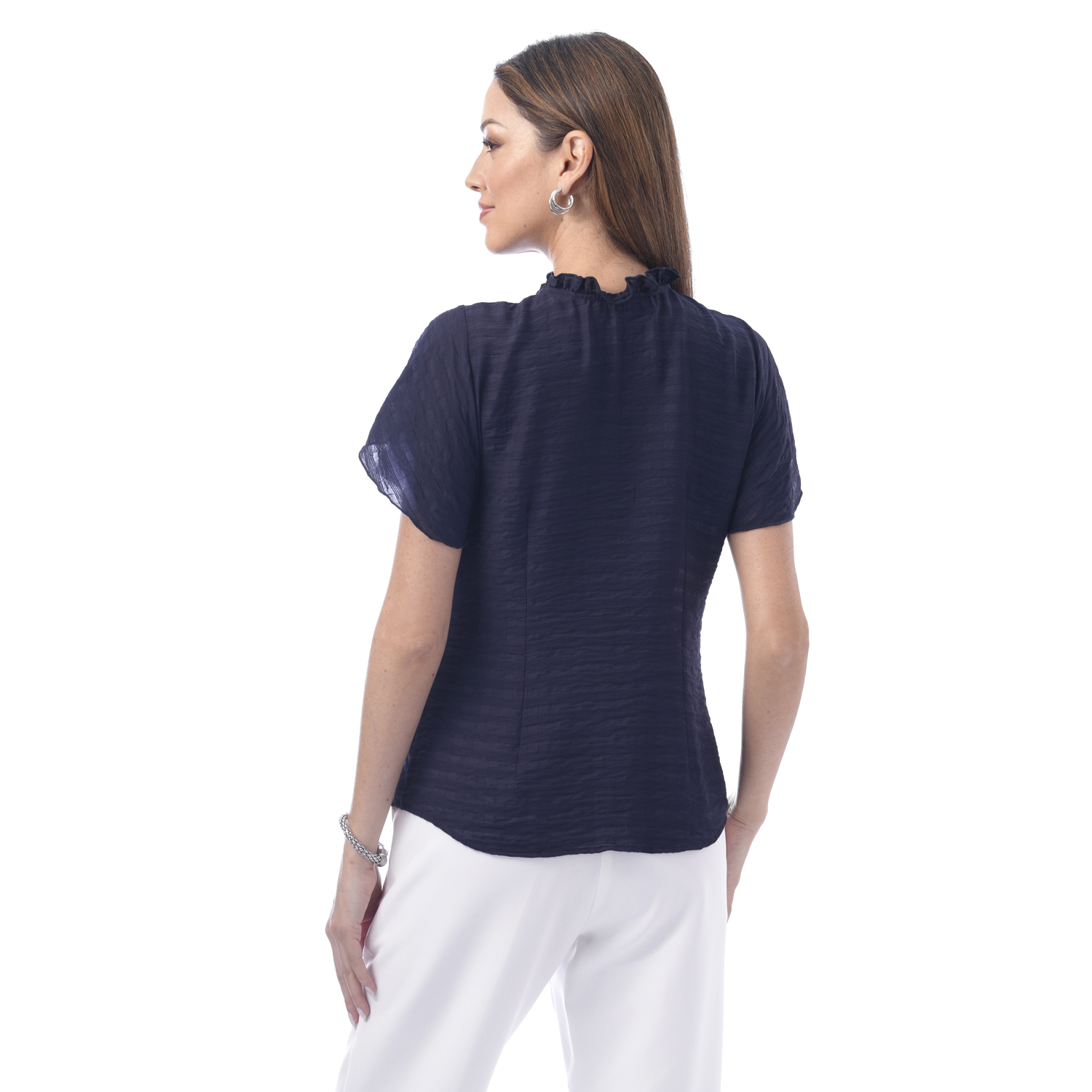 Esta blusa de color entero y manga corta ancha destaca por sus delicados detalles en el cuello que aportan un aire moderno. Su diseño la convierte en una pieza ideal para elevar looks versátiles.