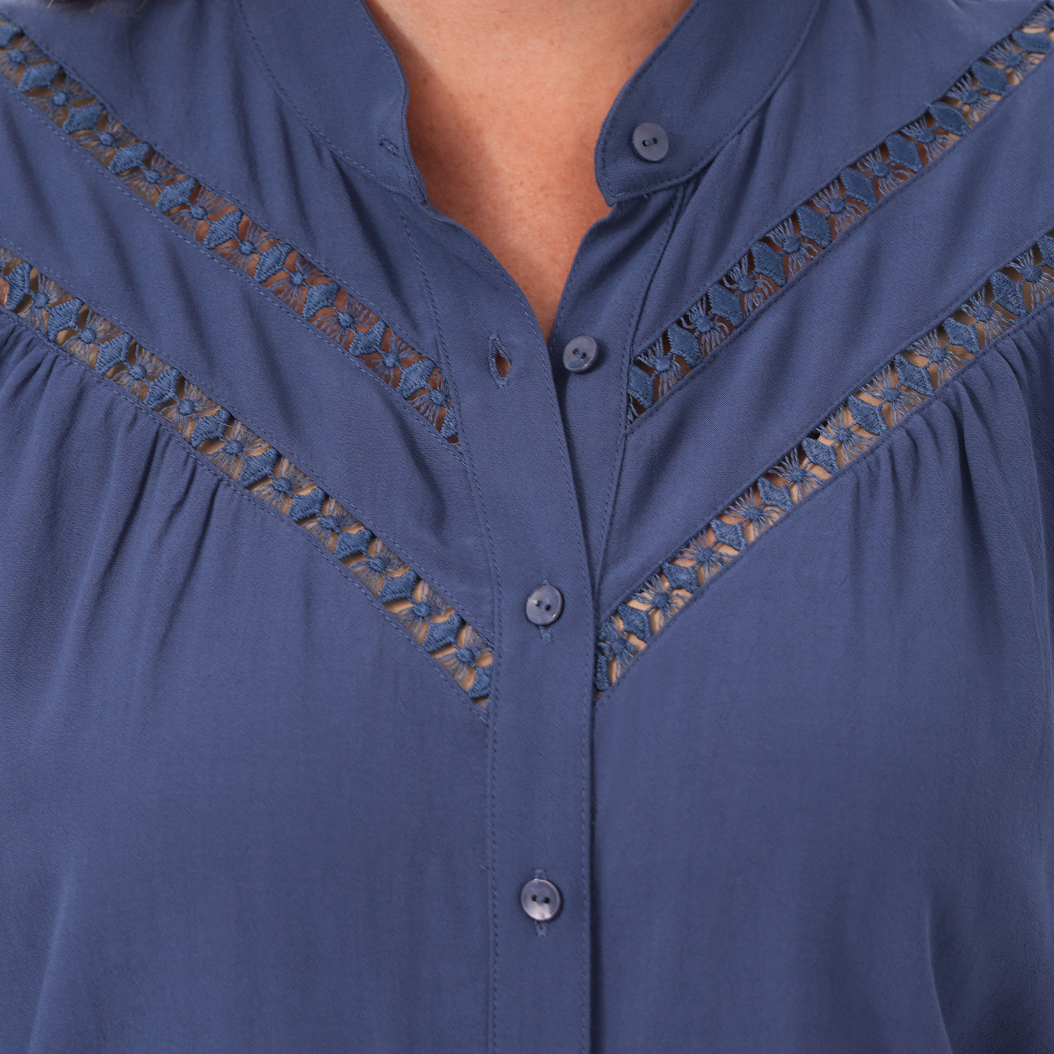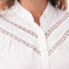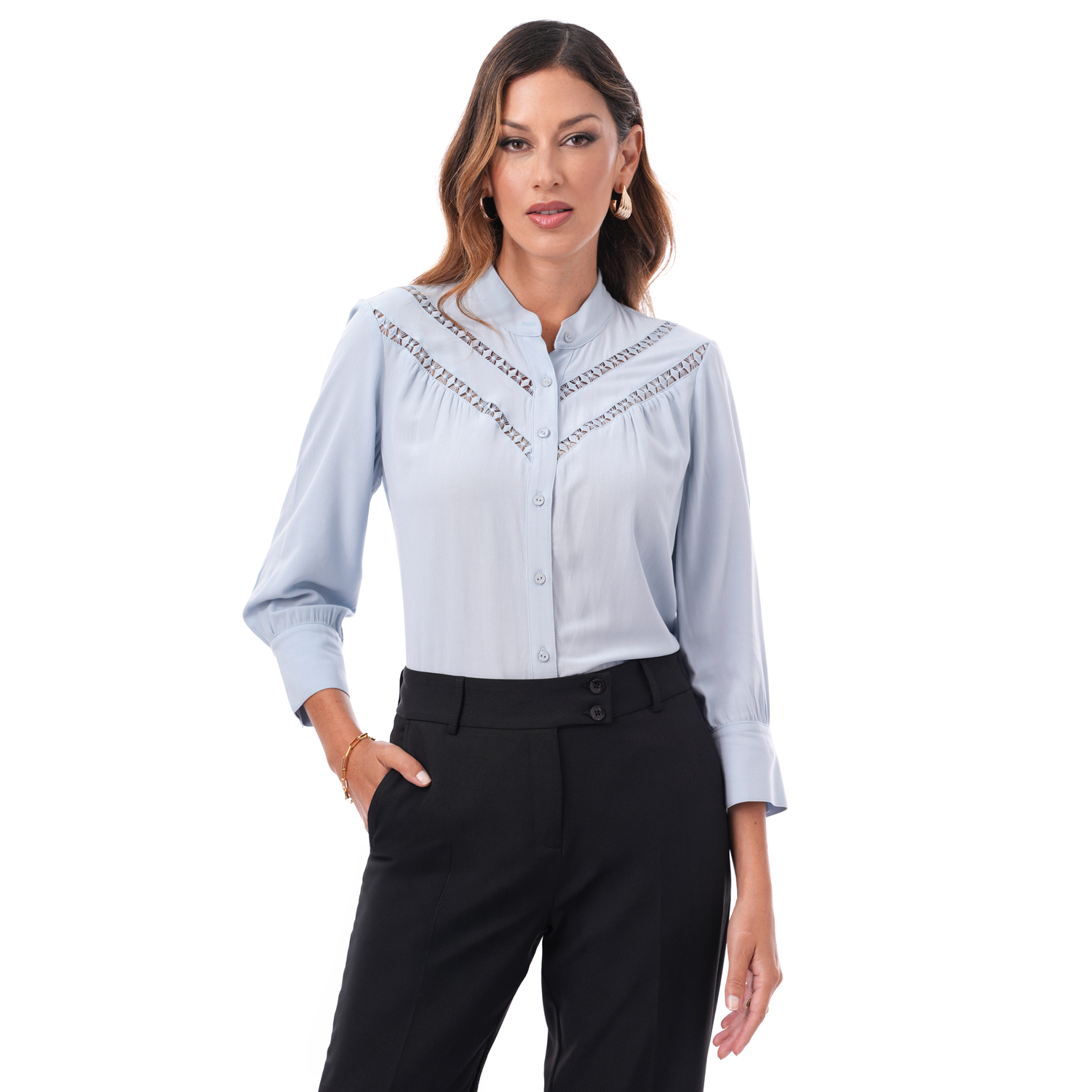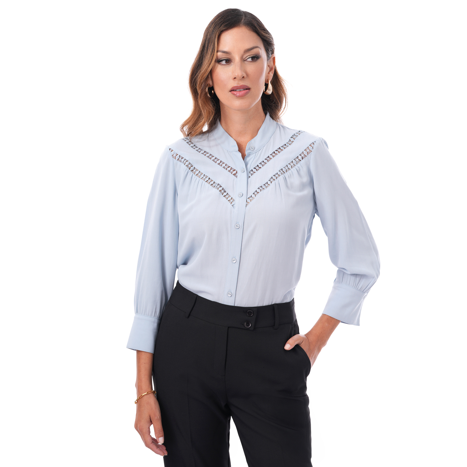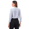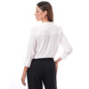 Esta blusa de manga 3/4 incorpora detalles de bipiur que aportan un acabado delicado al diseño, logrando un look sobrio, ideal para complementar outfits para diferentes ocasiones.