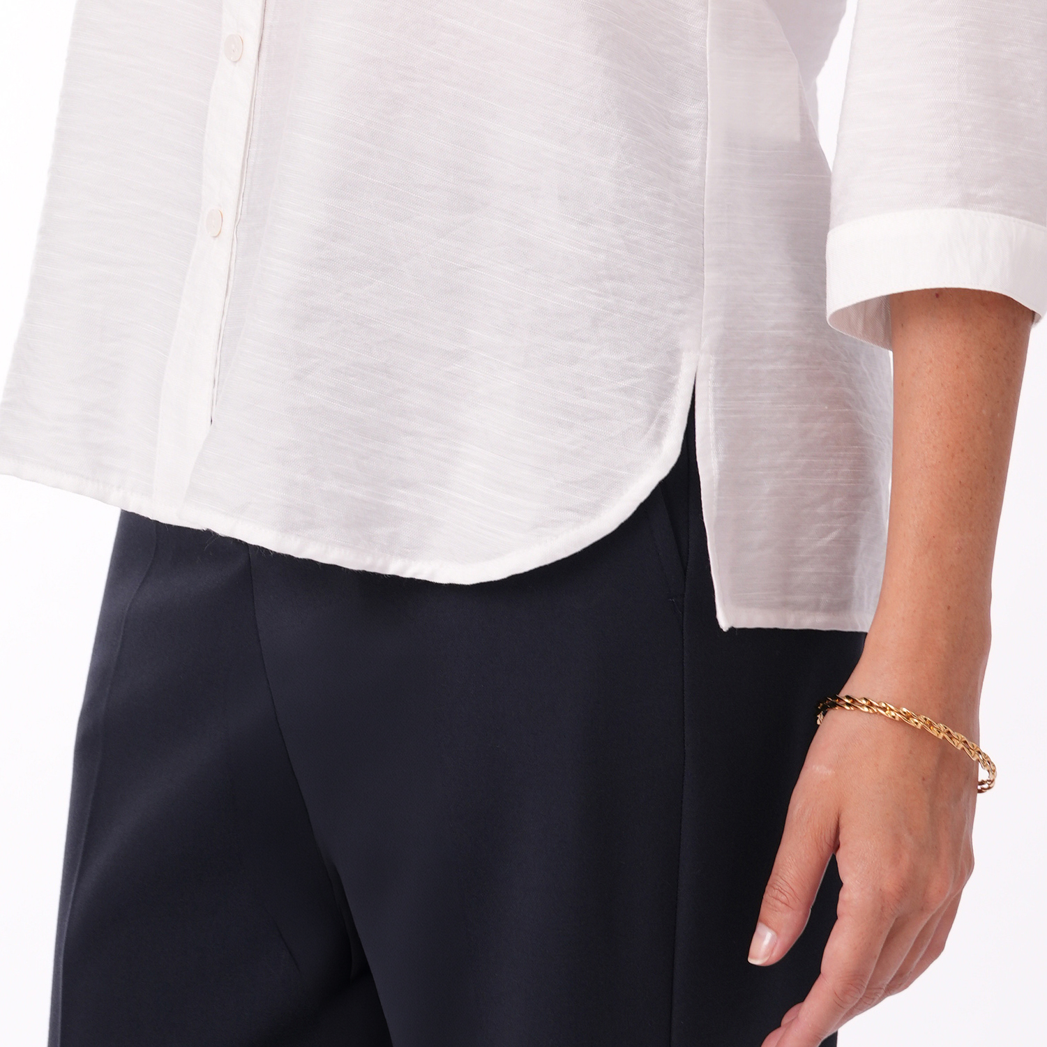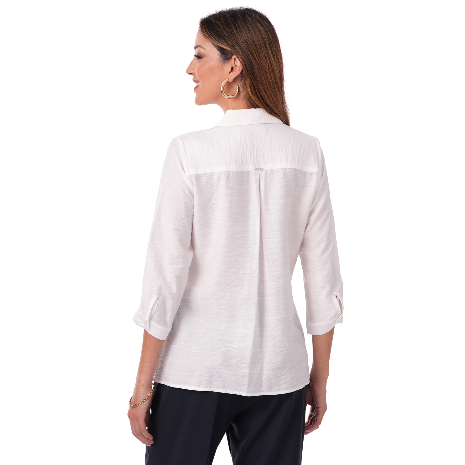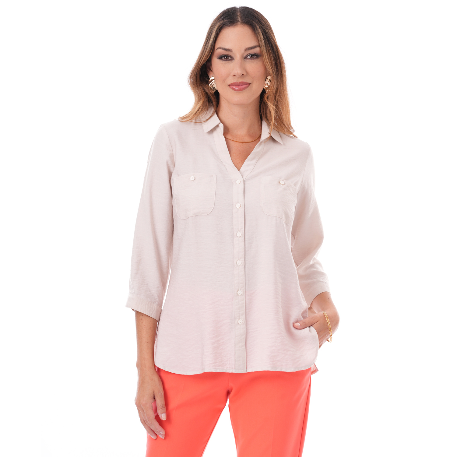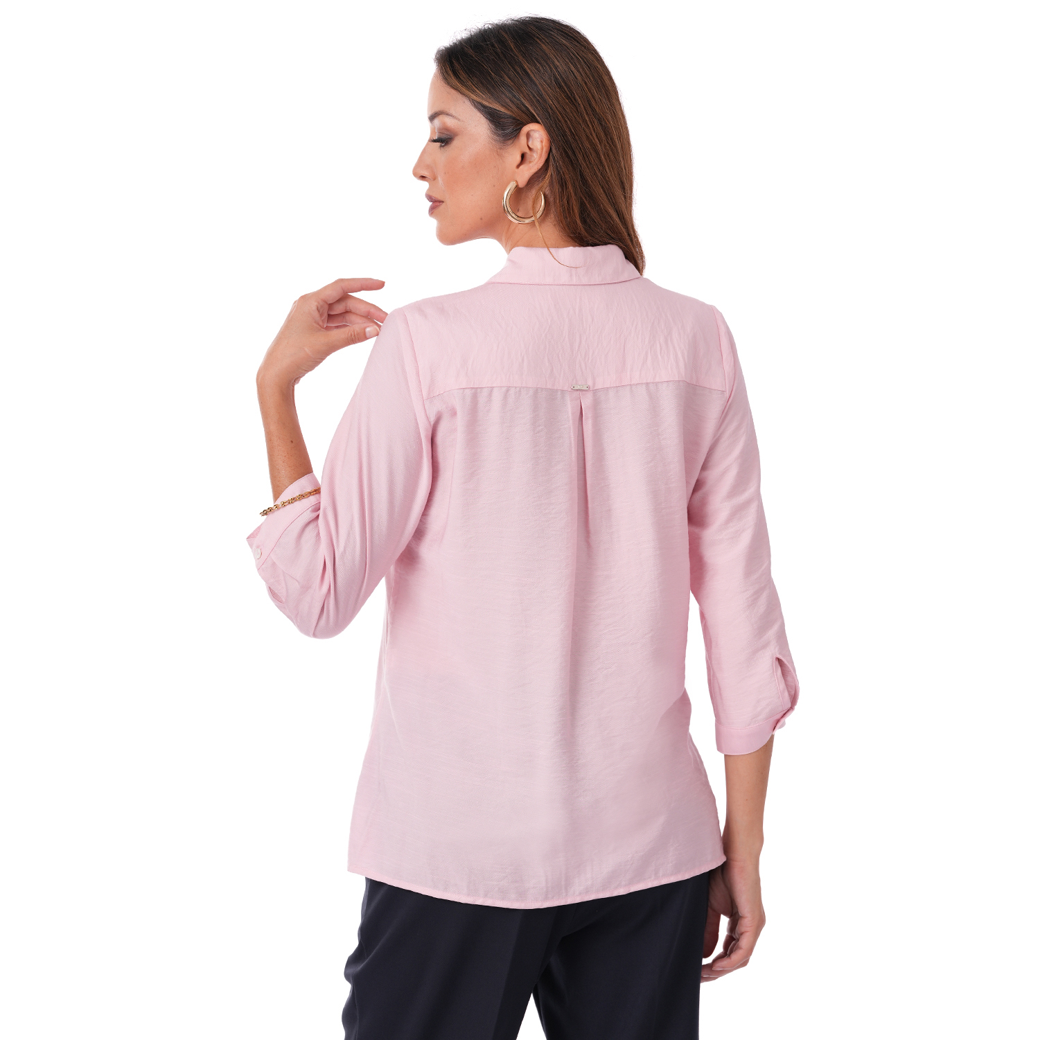Esta blusa de color entero con manga 3/4 aporta equilibrio y elegancia al look. Su diseño versátil permite crear combinaciones actuales con naturalidad.