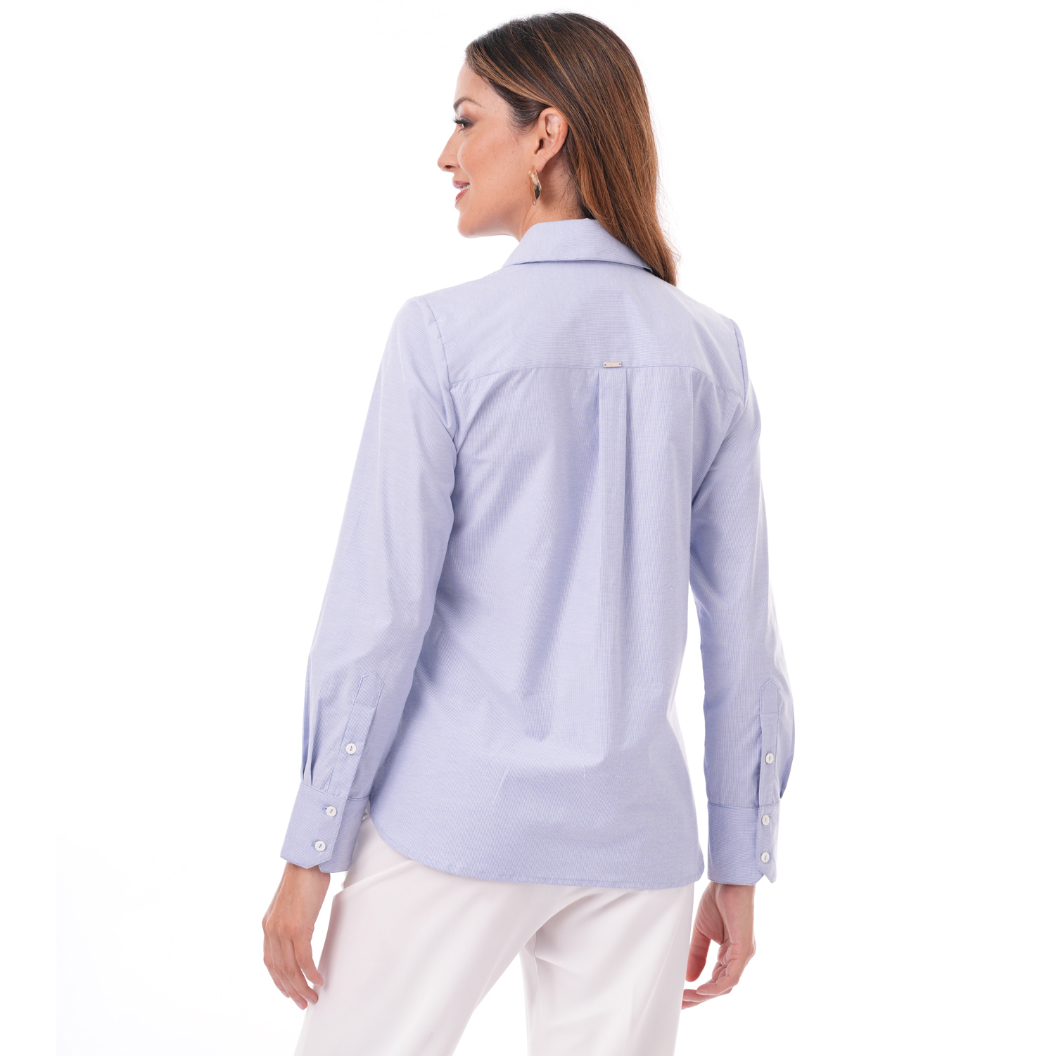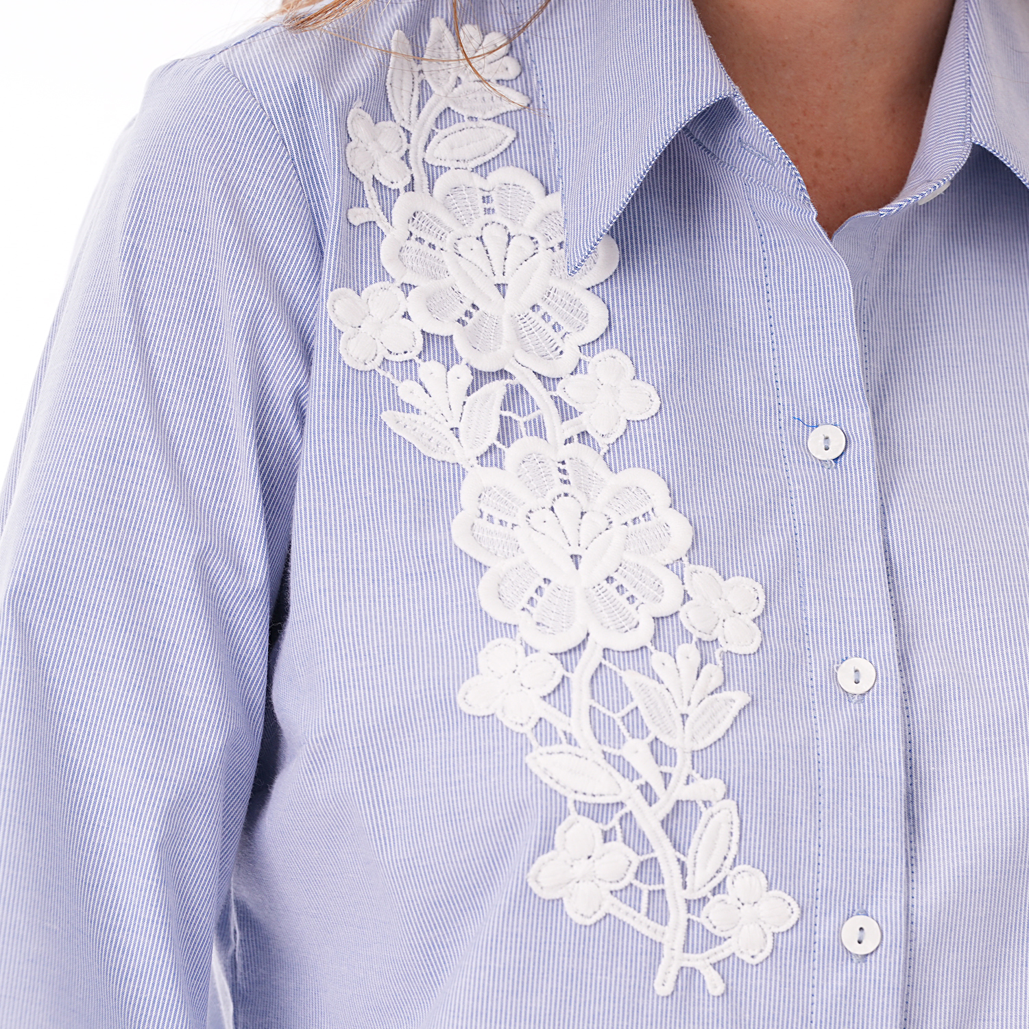 Esta blusa manga larga con detalle de flores en bipiur aporta un acento femenino y elegante al look.