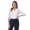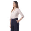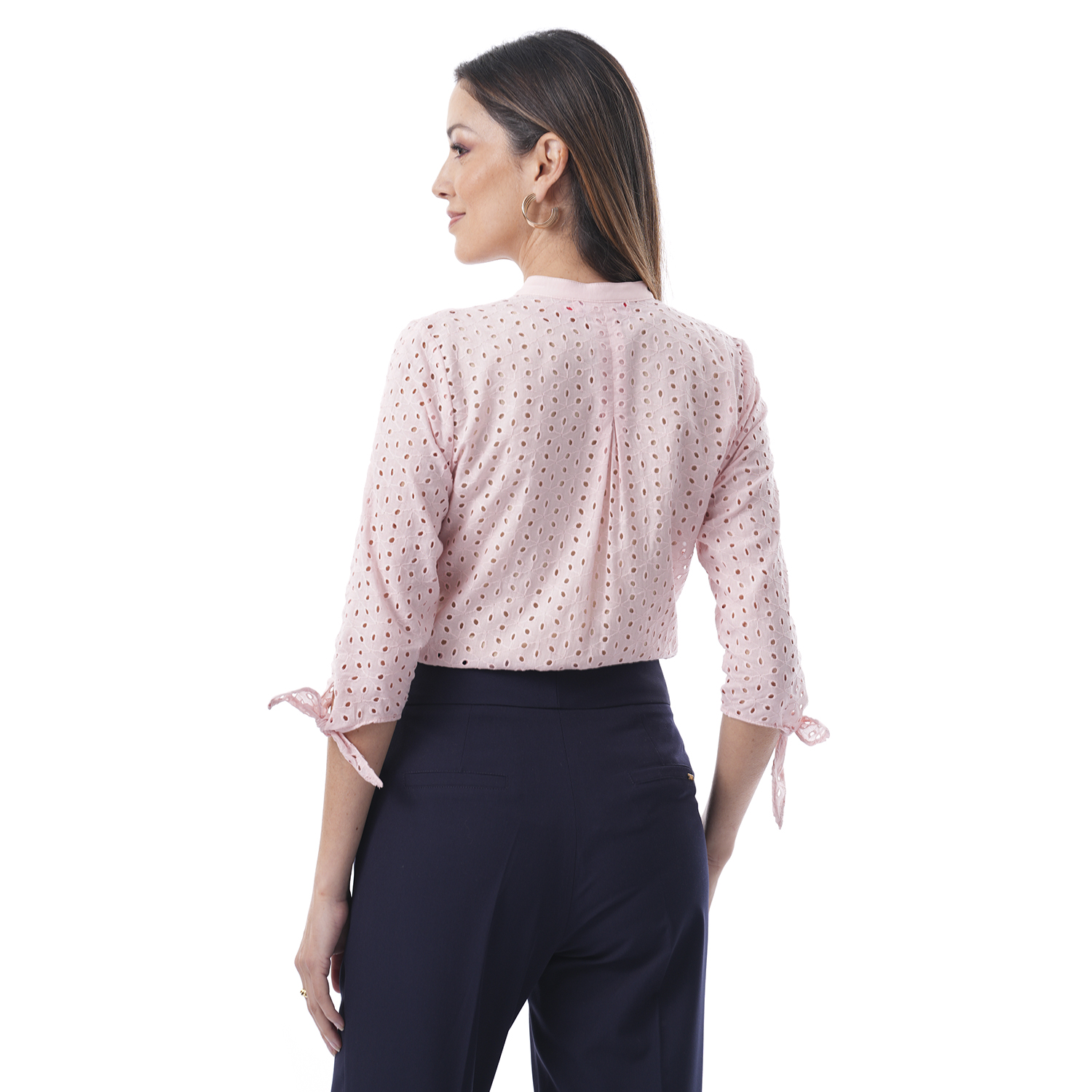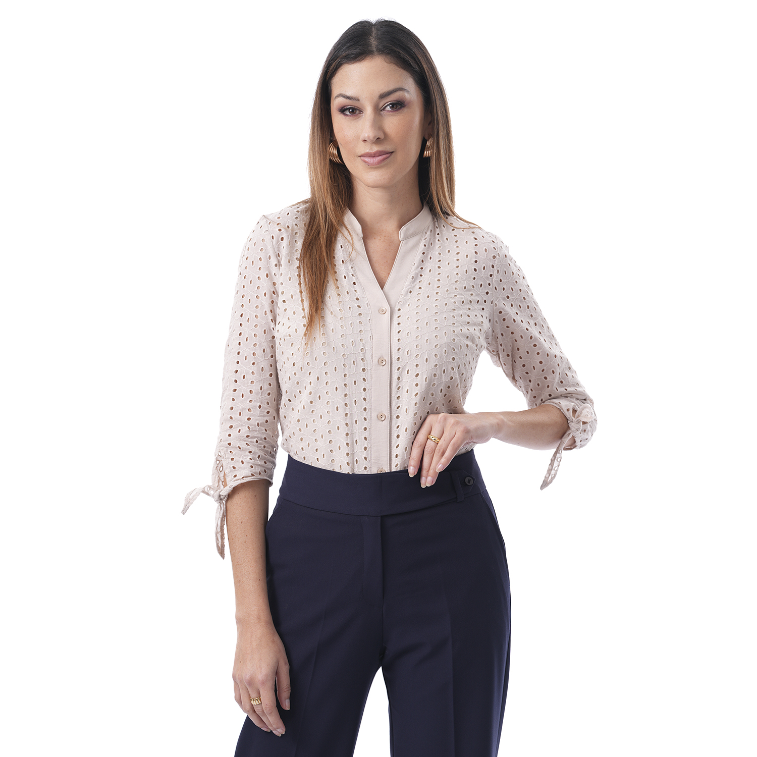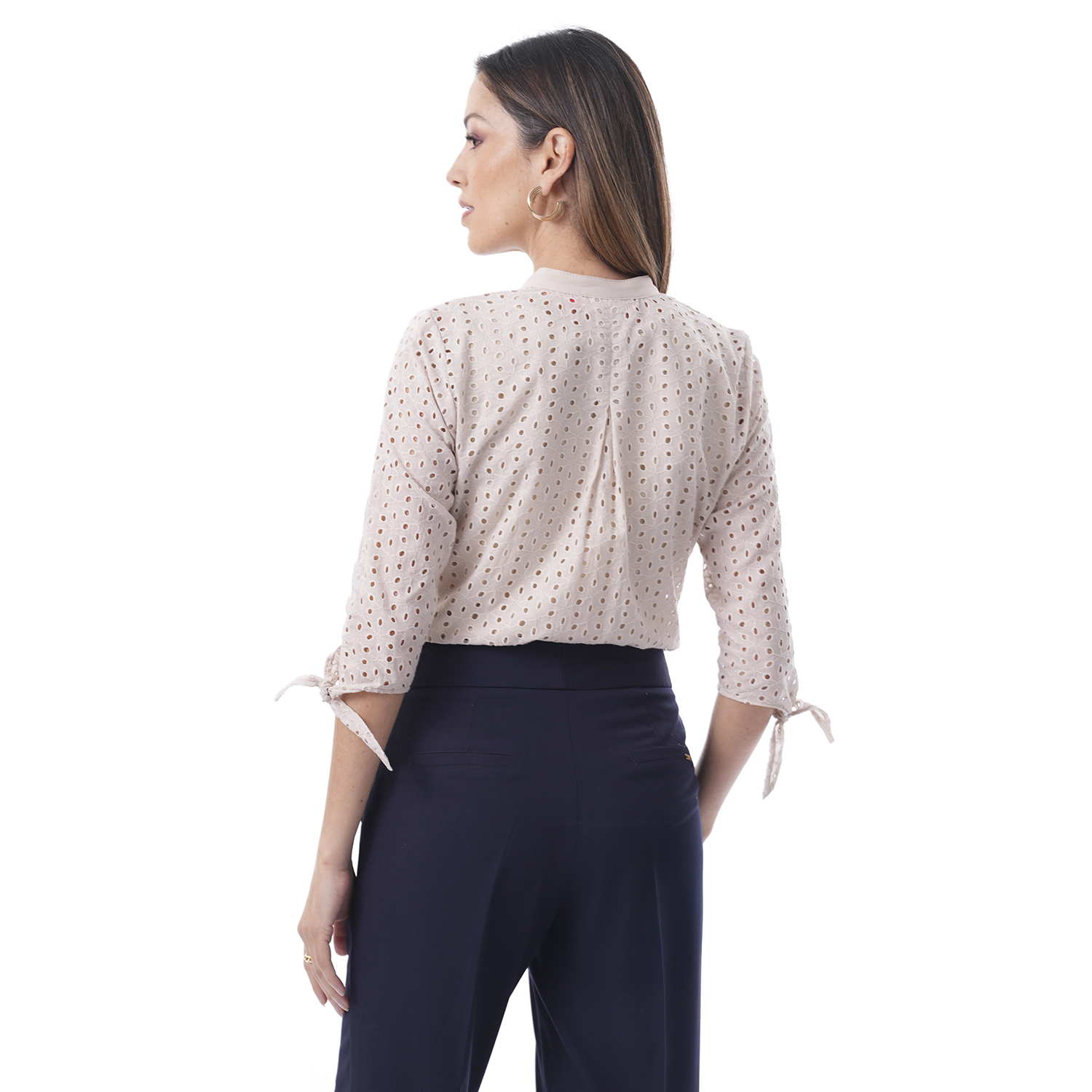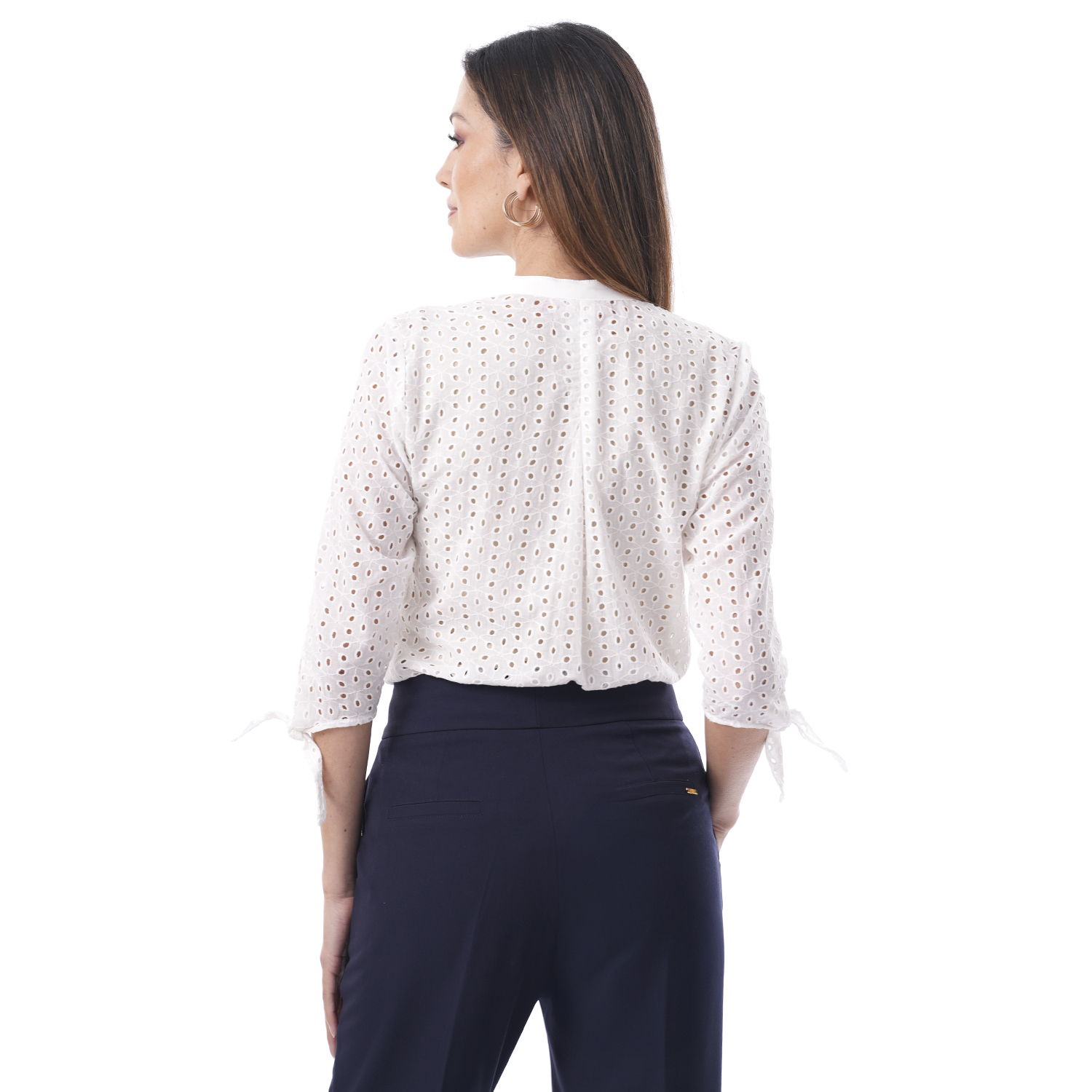 Esta blusa de manga 3/4 en broderie resalta por su delicadeza y frescura, ideal para darle un aire femenino y sofisticado a tus looks.