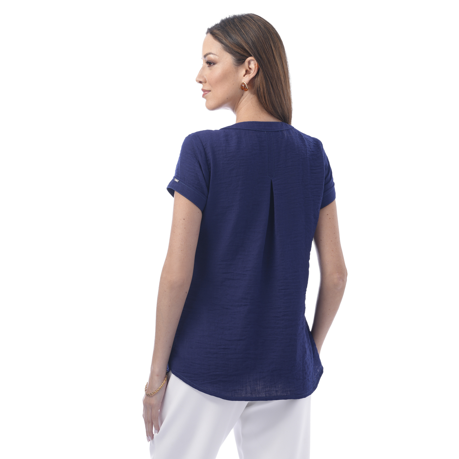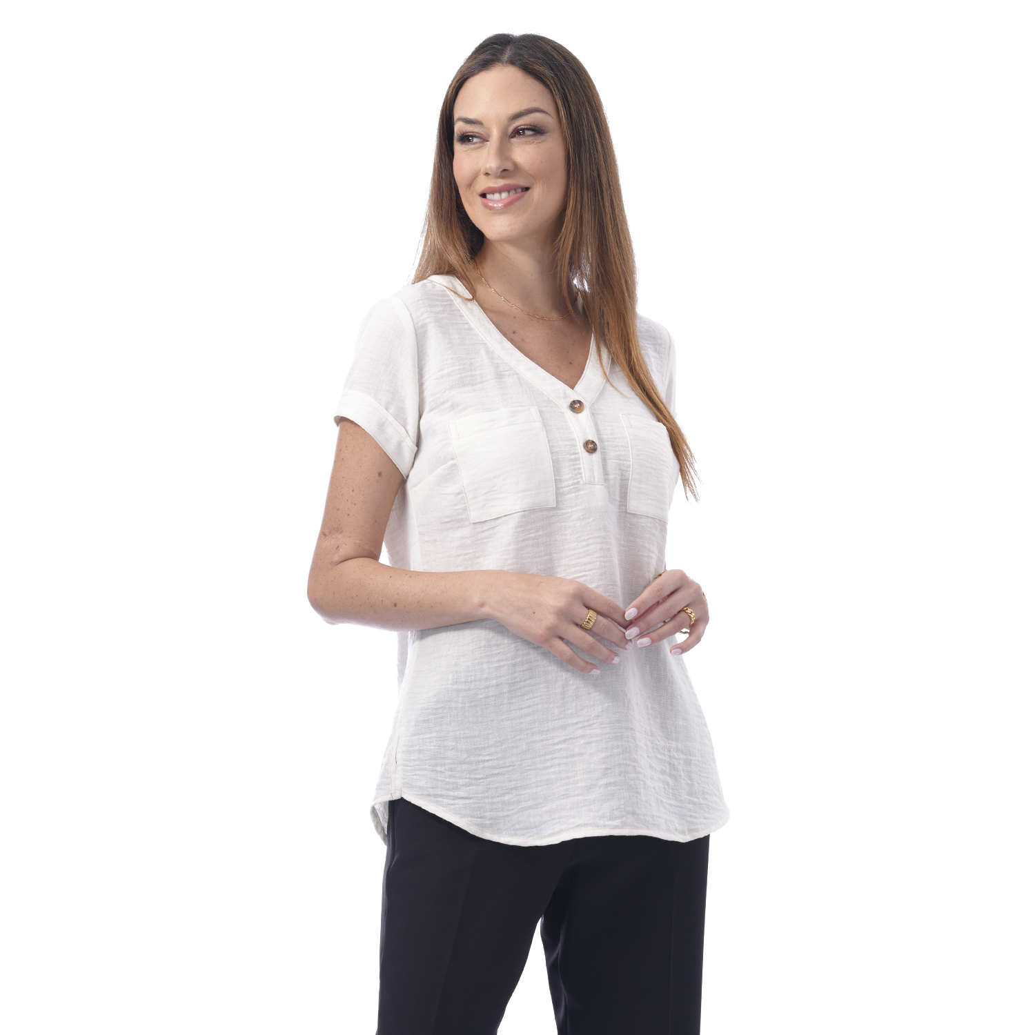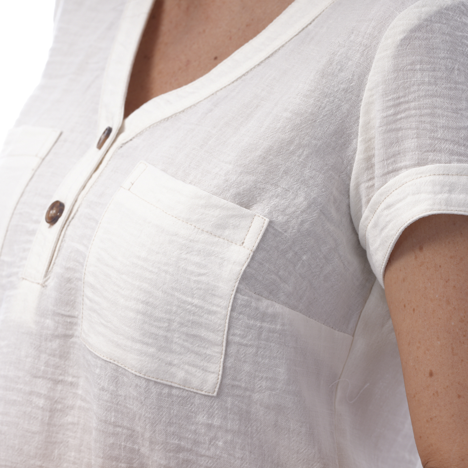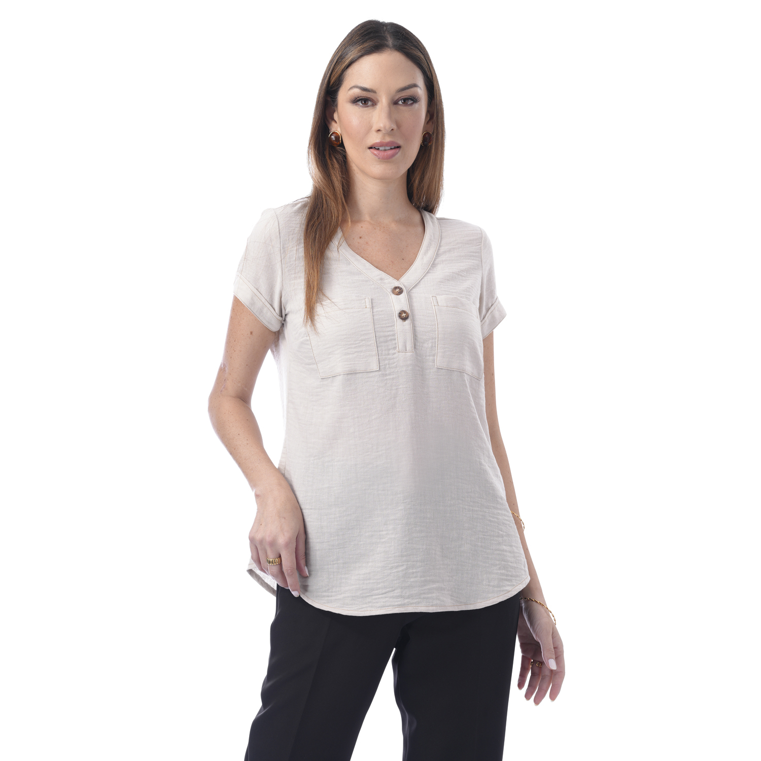Esta blusa de manga corta con pespuntes y bolsillos delanteros aporta un acabado moderno. Su diseño eleva cualquier look creando un estilo sofisticado único.