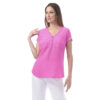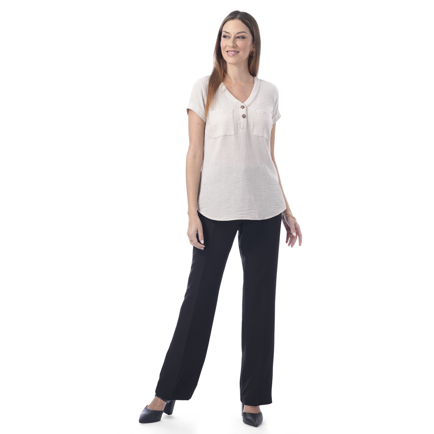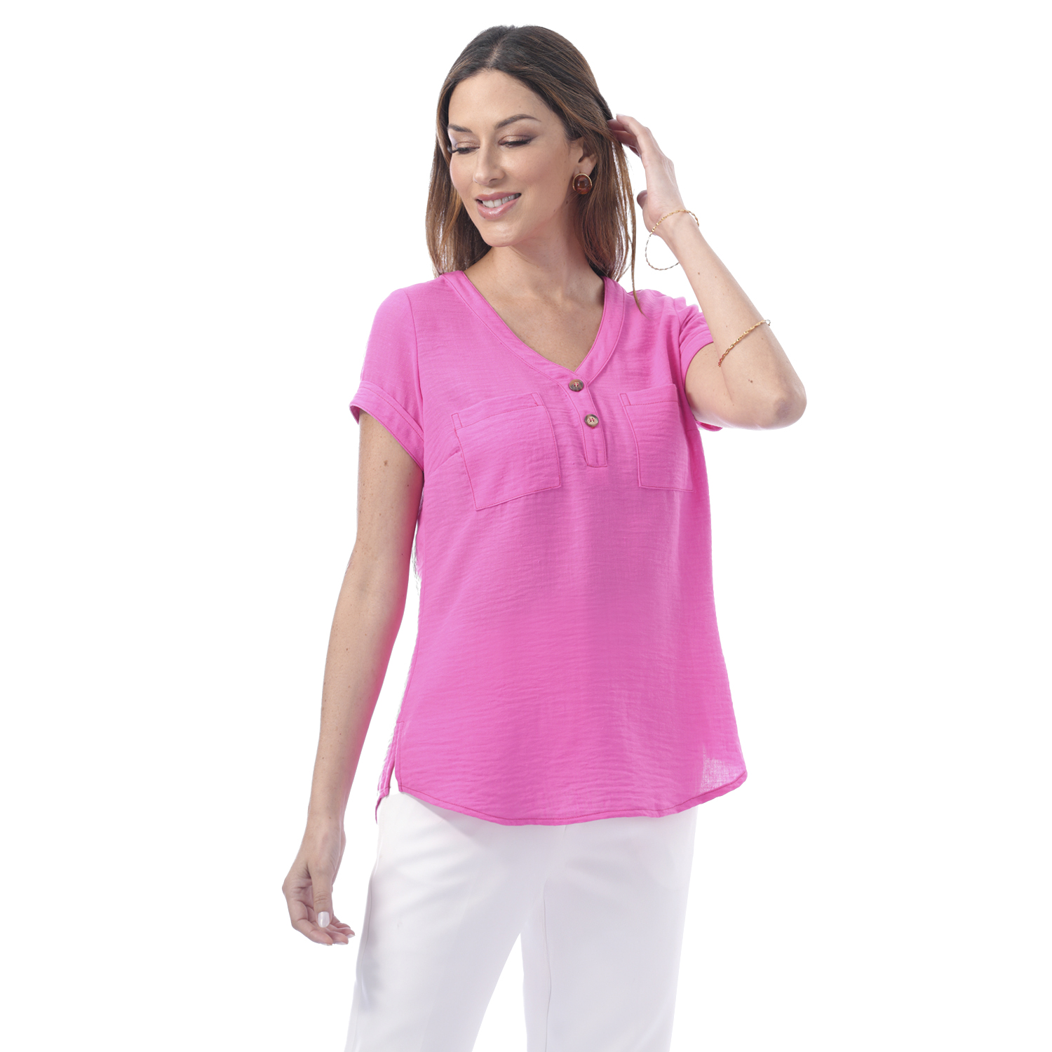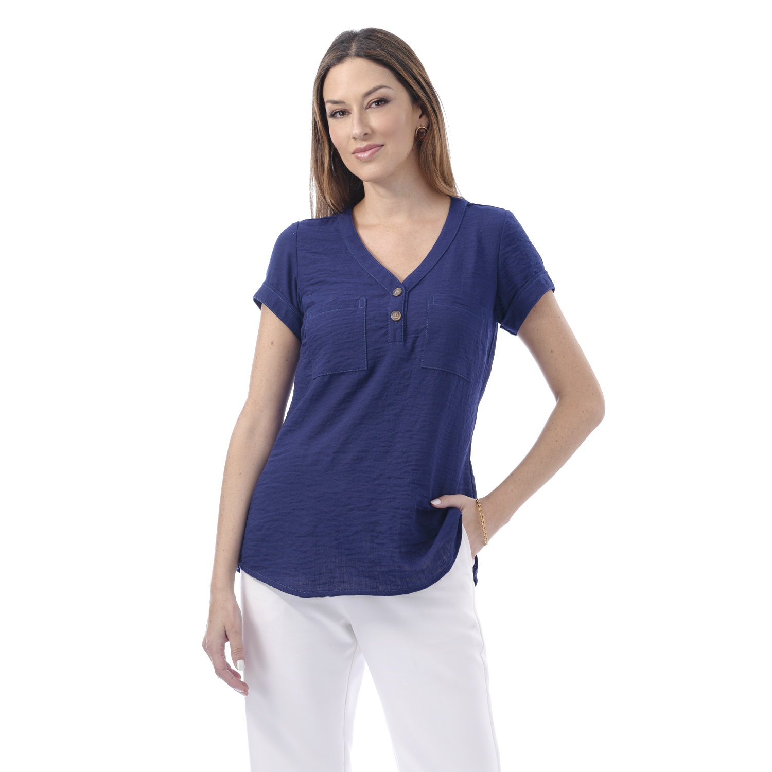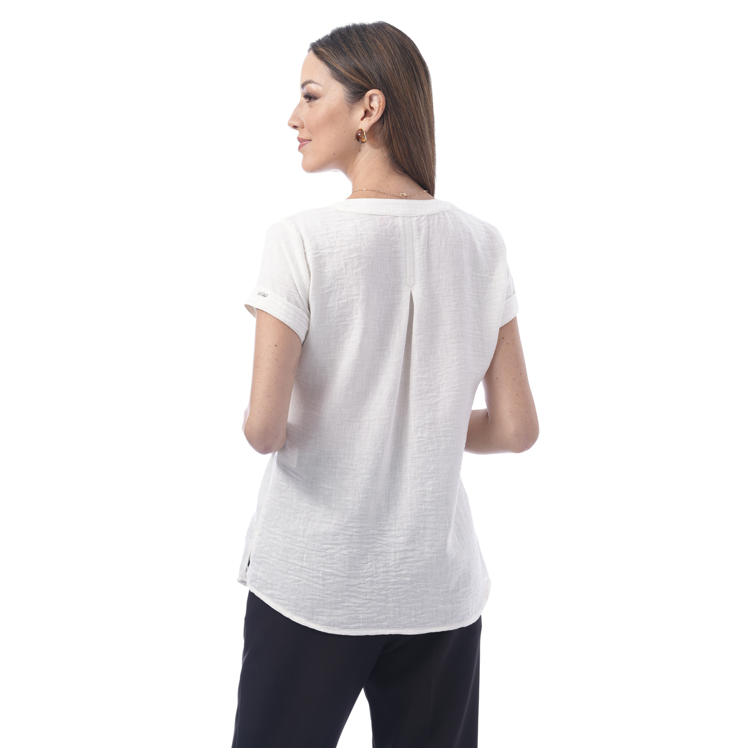 Esta blusa de manga corta con pespuntes y bolsillos delanteros aporta un acabado moderno. Su diseño eleva cualquier look creando un estilo sofisticado único.