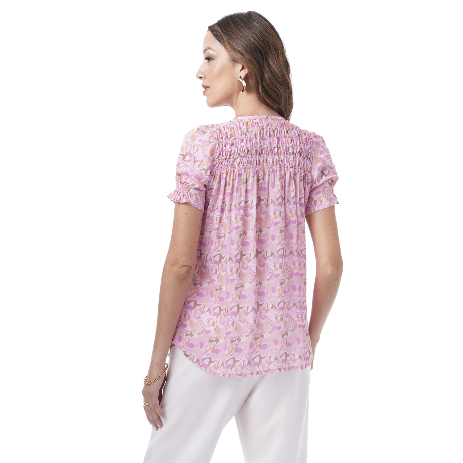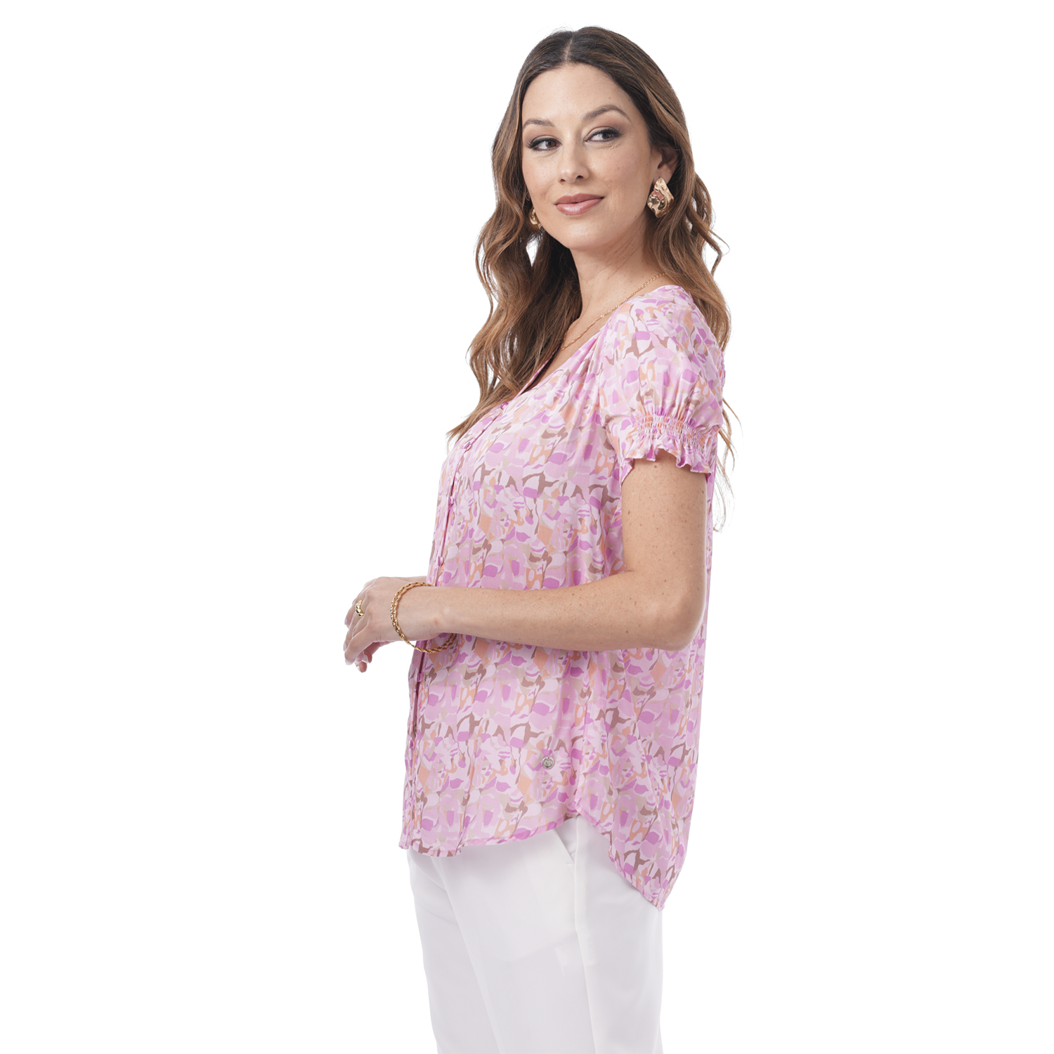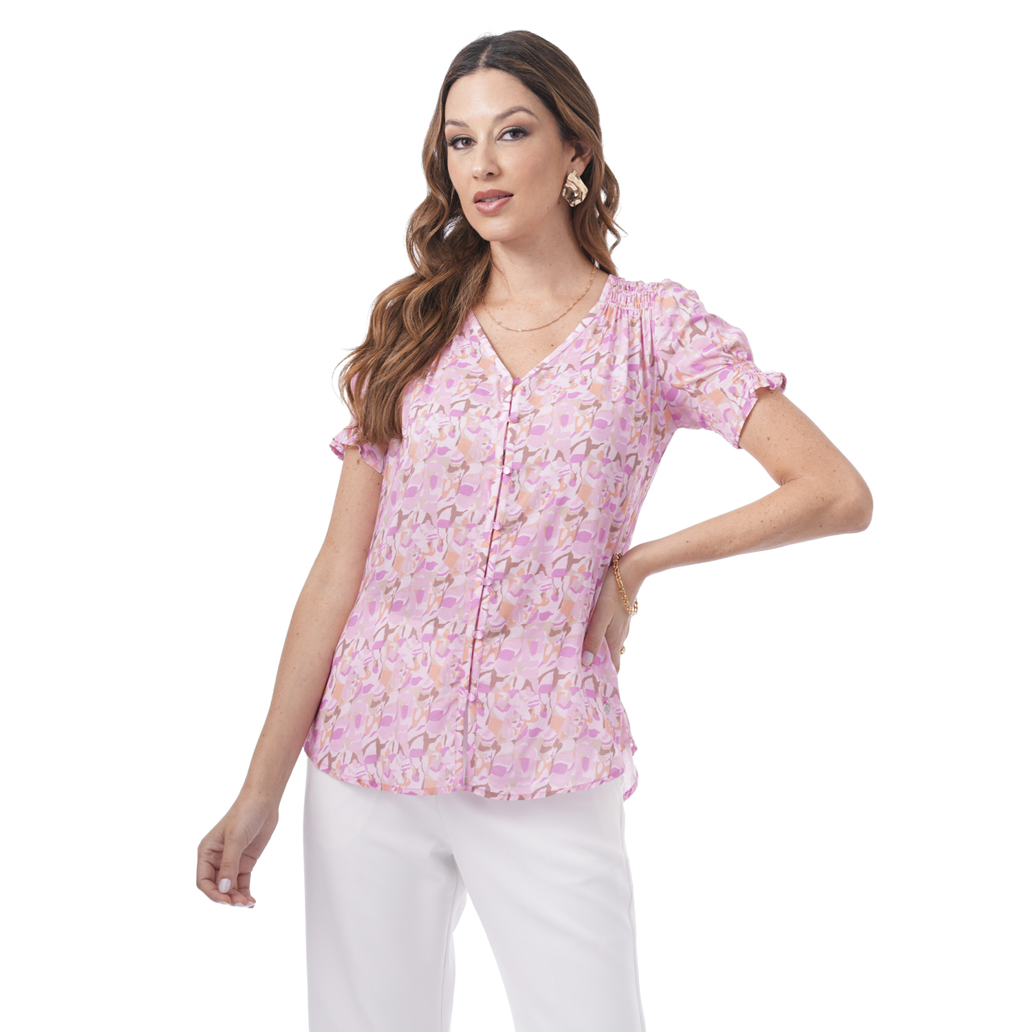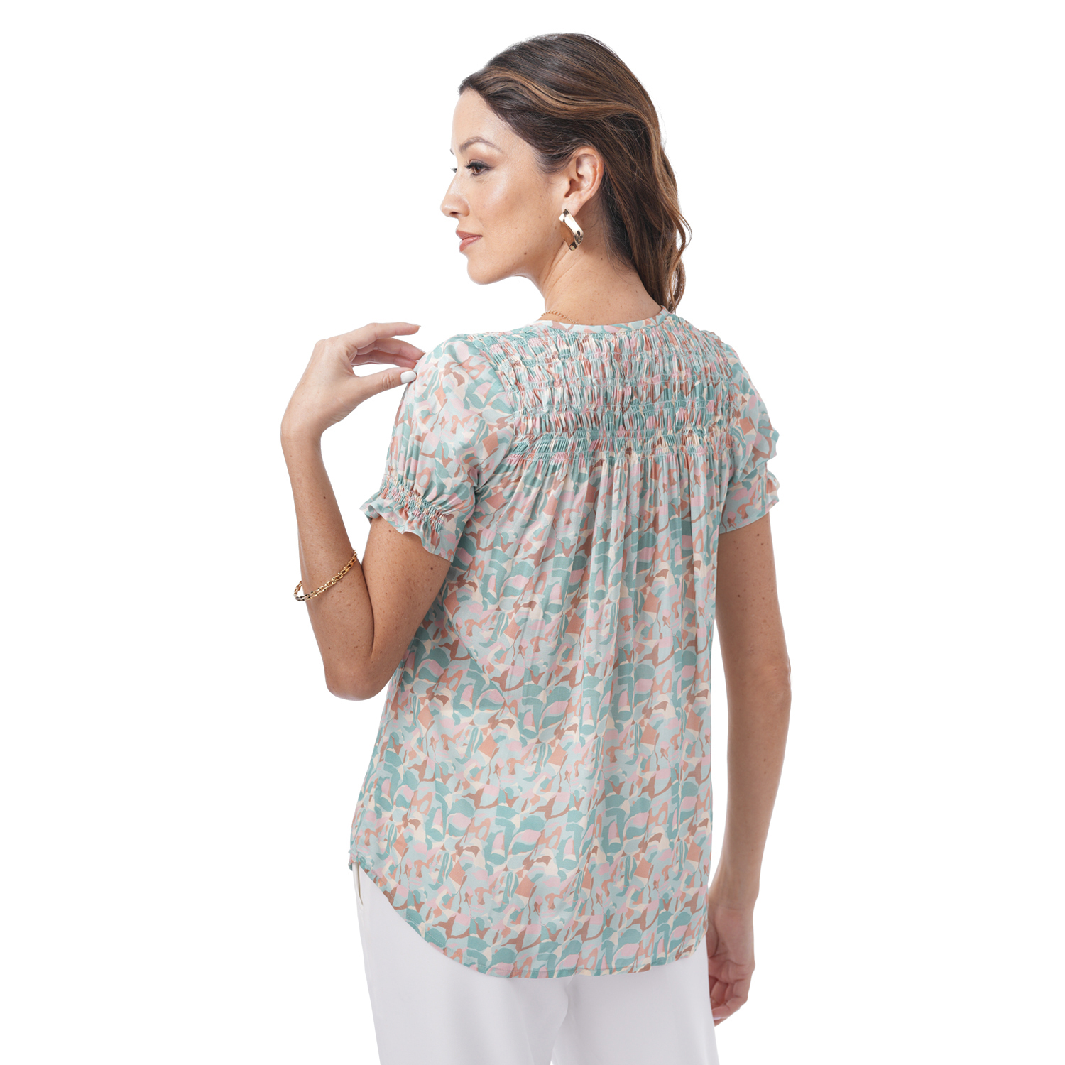Esta blusa estampada ofrece un acabado ligero y femenino, perfecta para elevar cualquier combinación del día a día.
