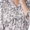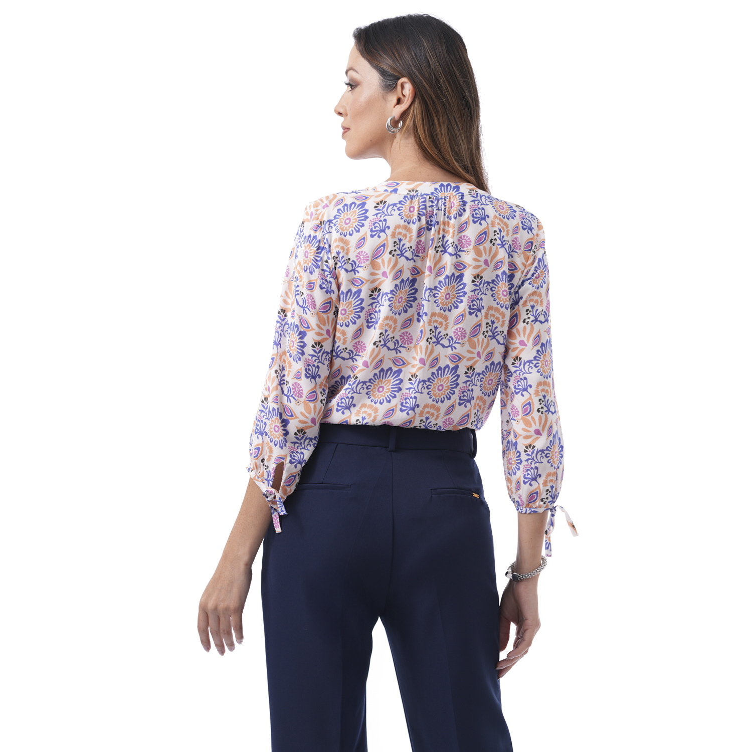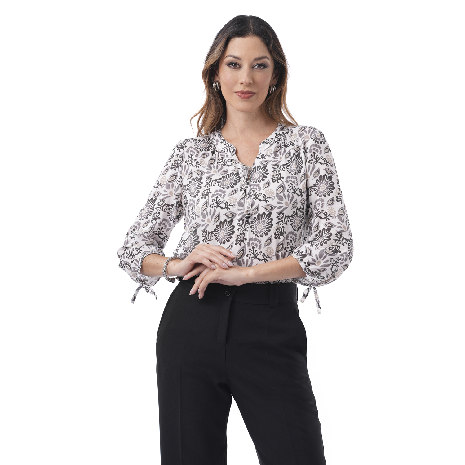 Esta blusa estampada con detalle en la manga 3/4 destaca por su diseño refinado y femenino. Su estilo moderno y acabado elegante la convierten en una pieza perfecta para elevar looks con sutileza y sofisticación.