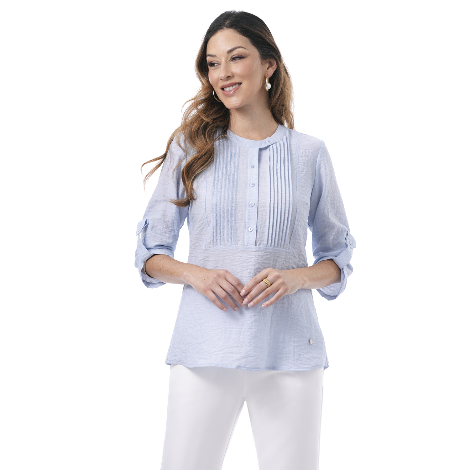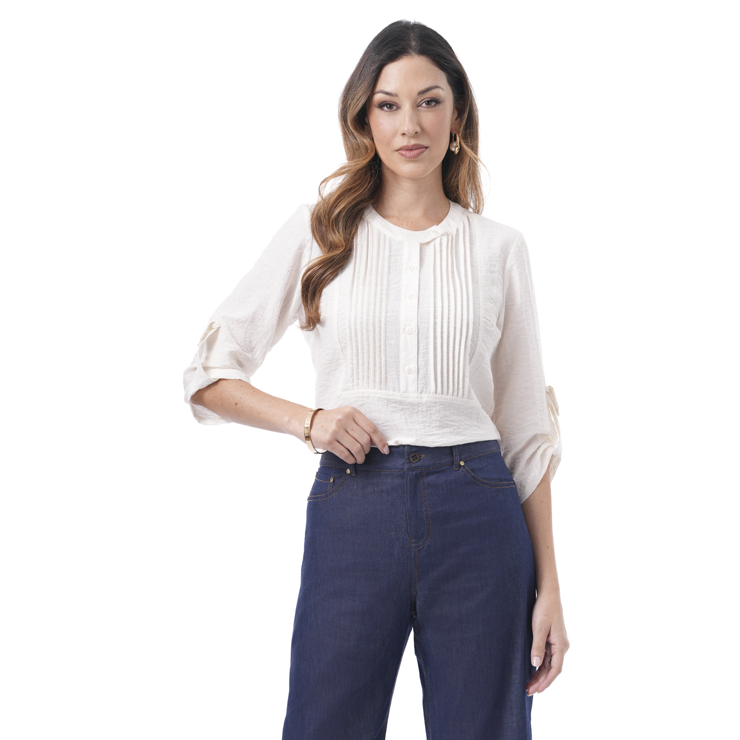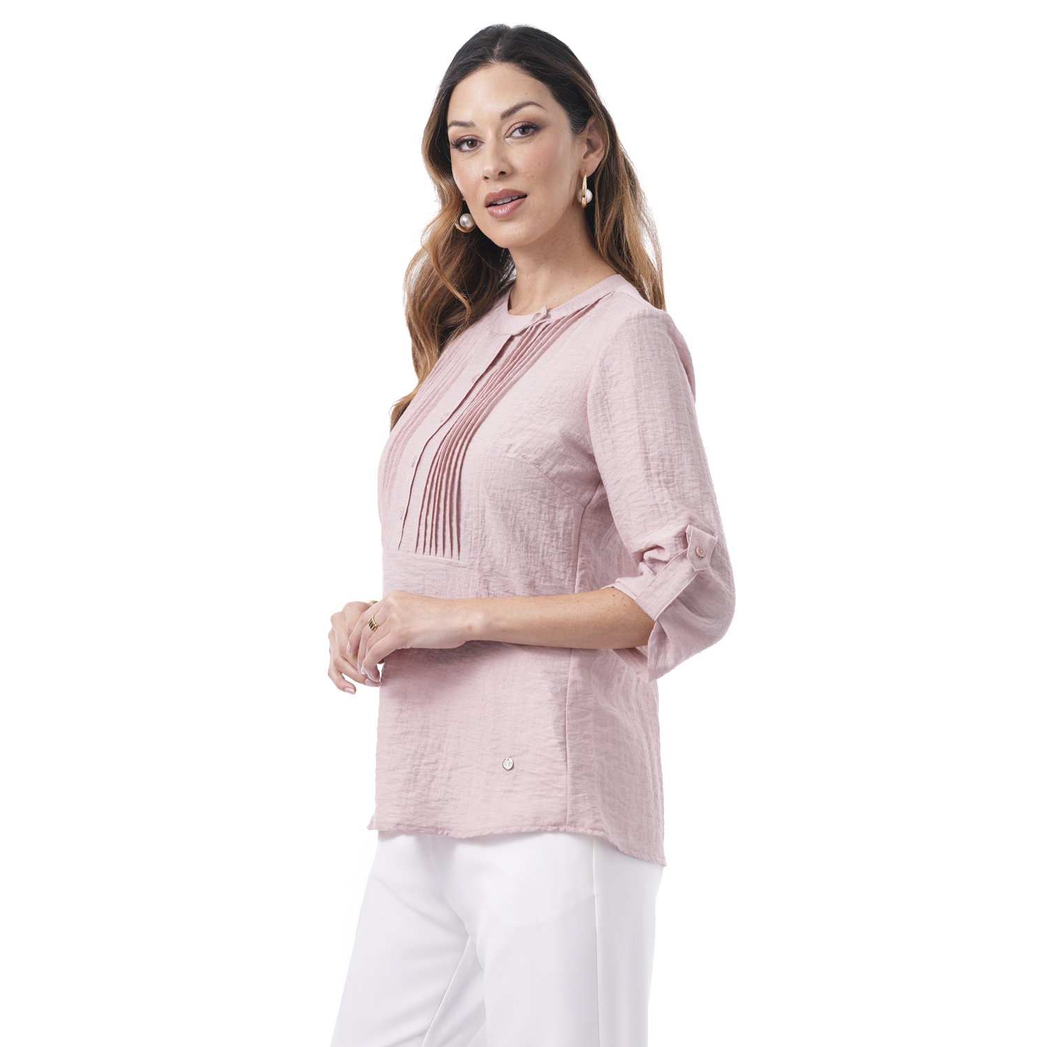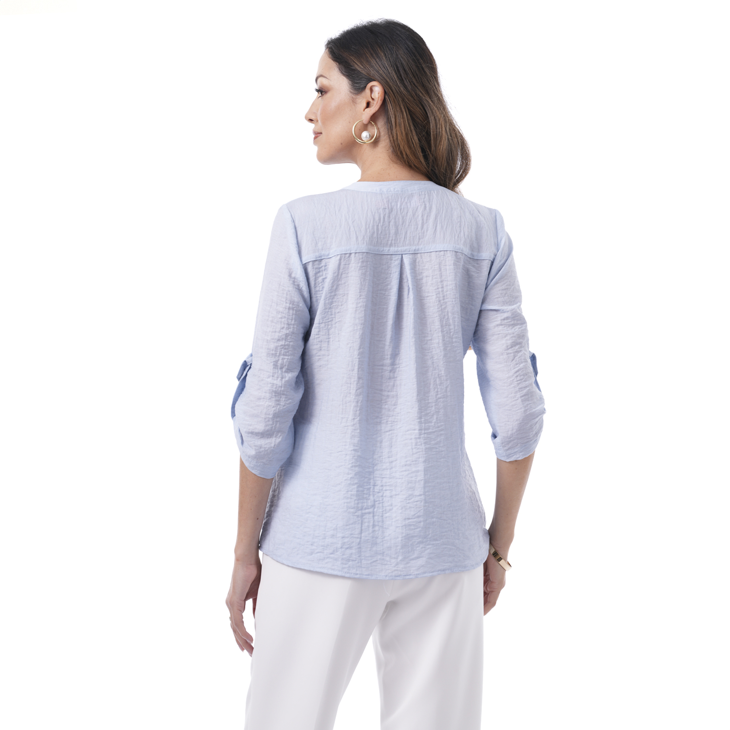 Esta blusa de color entero y manga 3/4 combina líneas limpias y un estilo refinado. Su diseño elegante y atemporal la convierte en una prenda esencial para lograr una apariencia moderna y sofisticada.