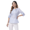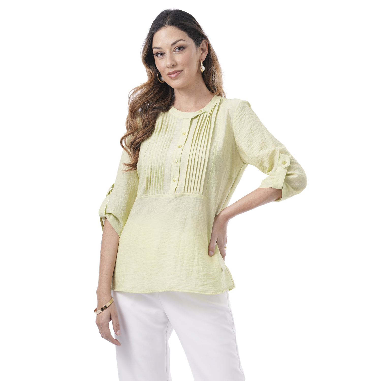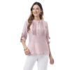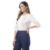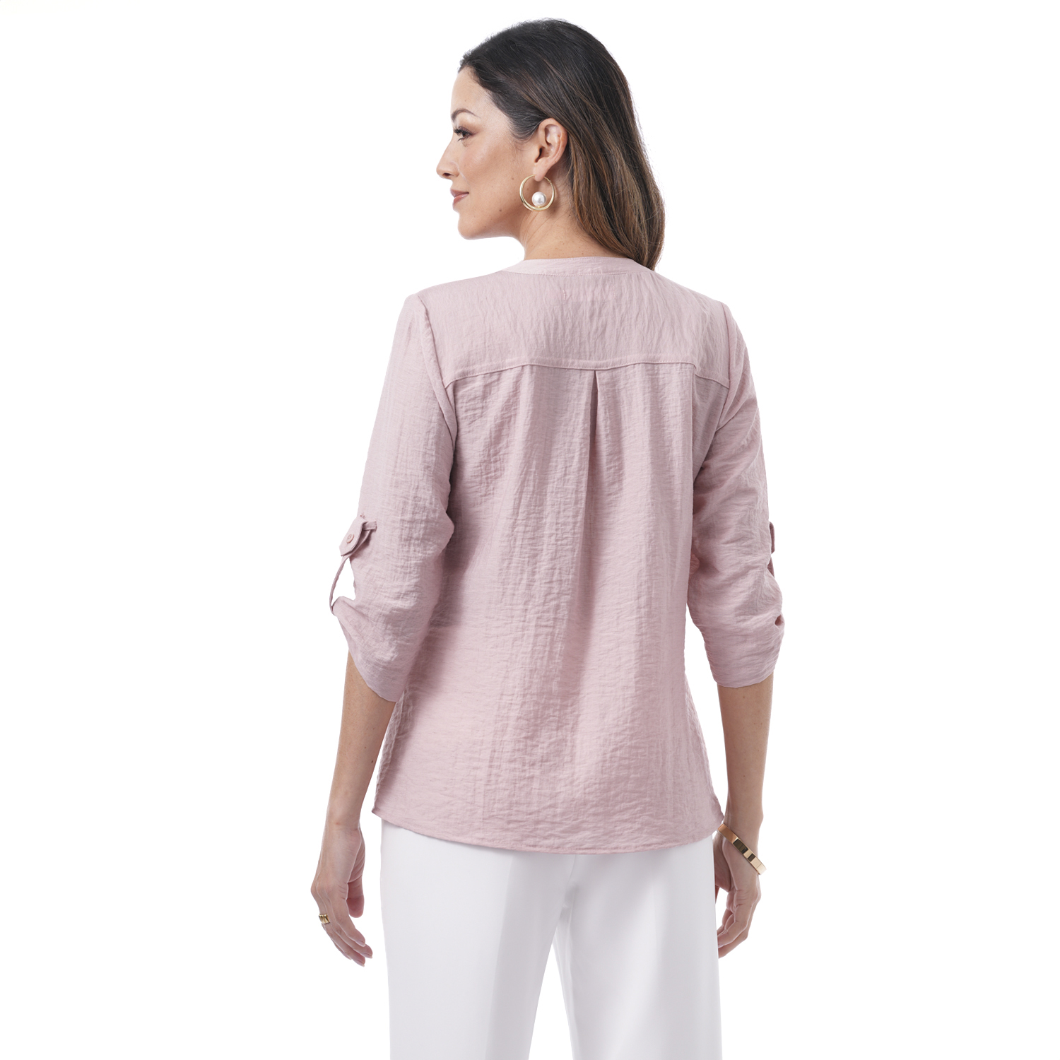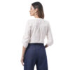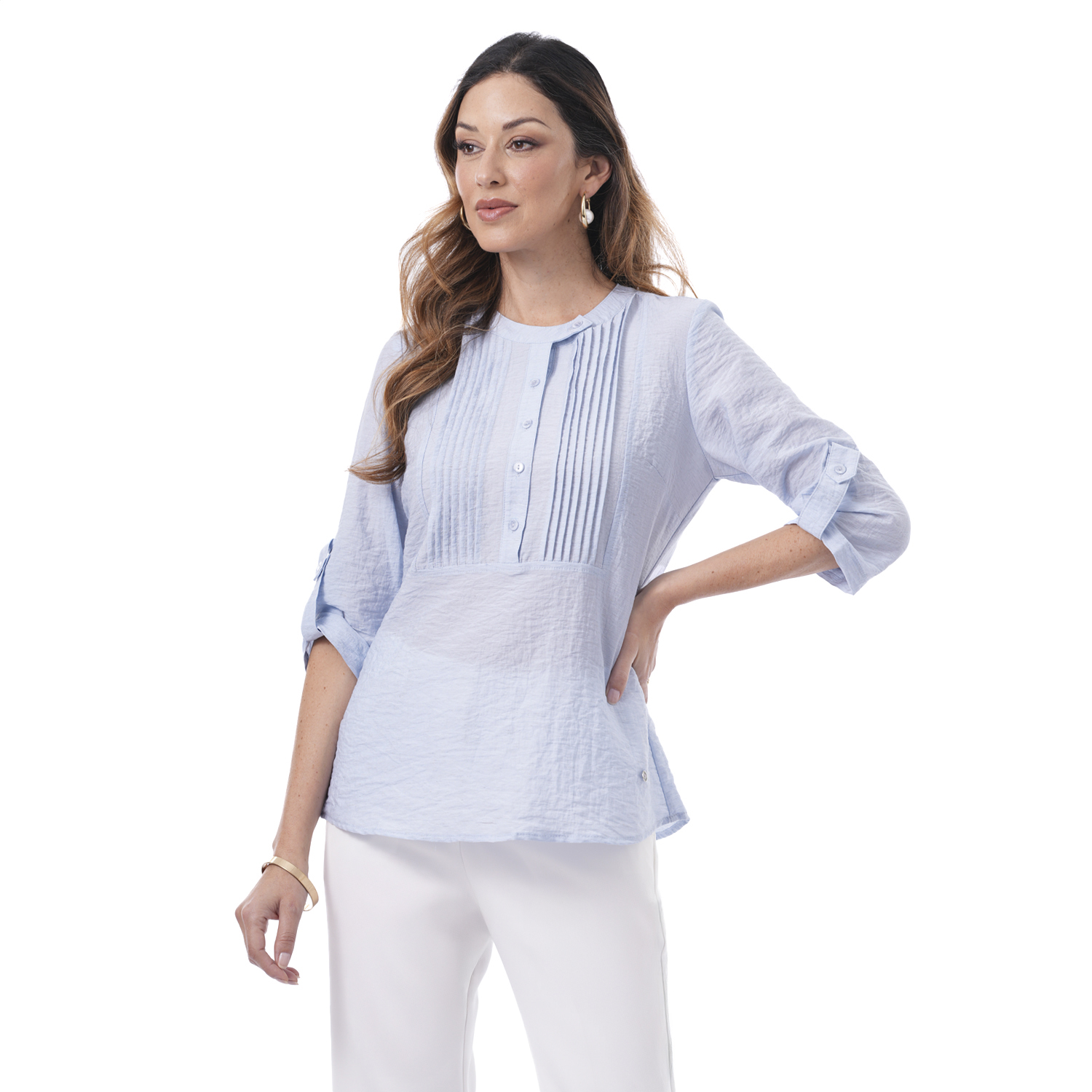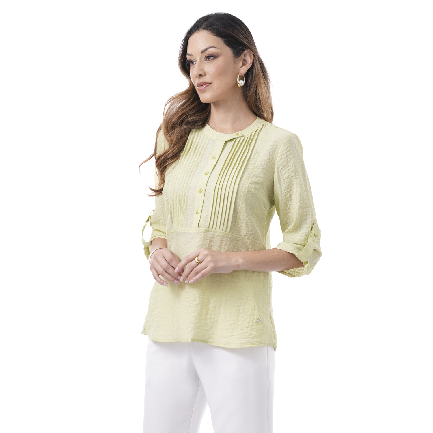 Esta blusa de color entero y manga 3/4 combina líneas limpias y un estilo refinado. Su diseño elegante y atemporal la convierte en una prenda esencial para lograr una apariencia moderna y sofisticada.