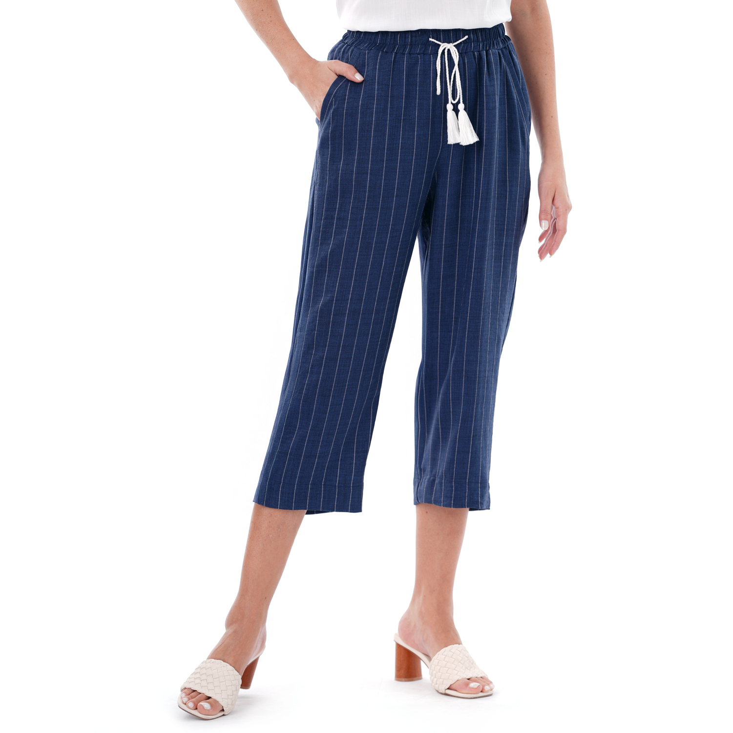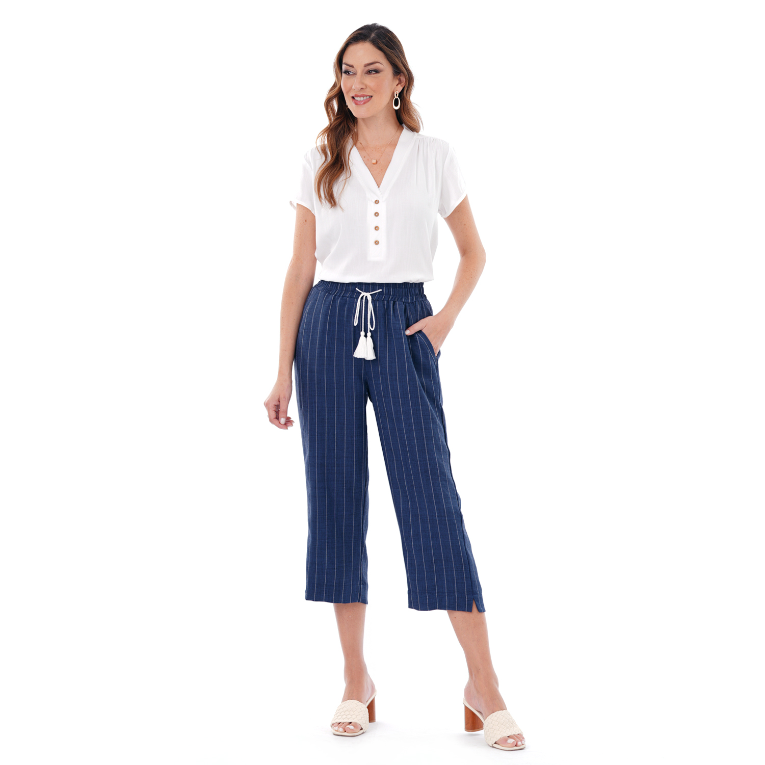 Este capri a rayas con detalles presenta un diseño moderno y versátil, ideal para crear looks actuales con un toque distintivo.