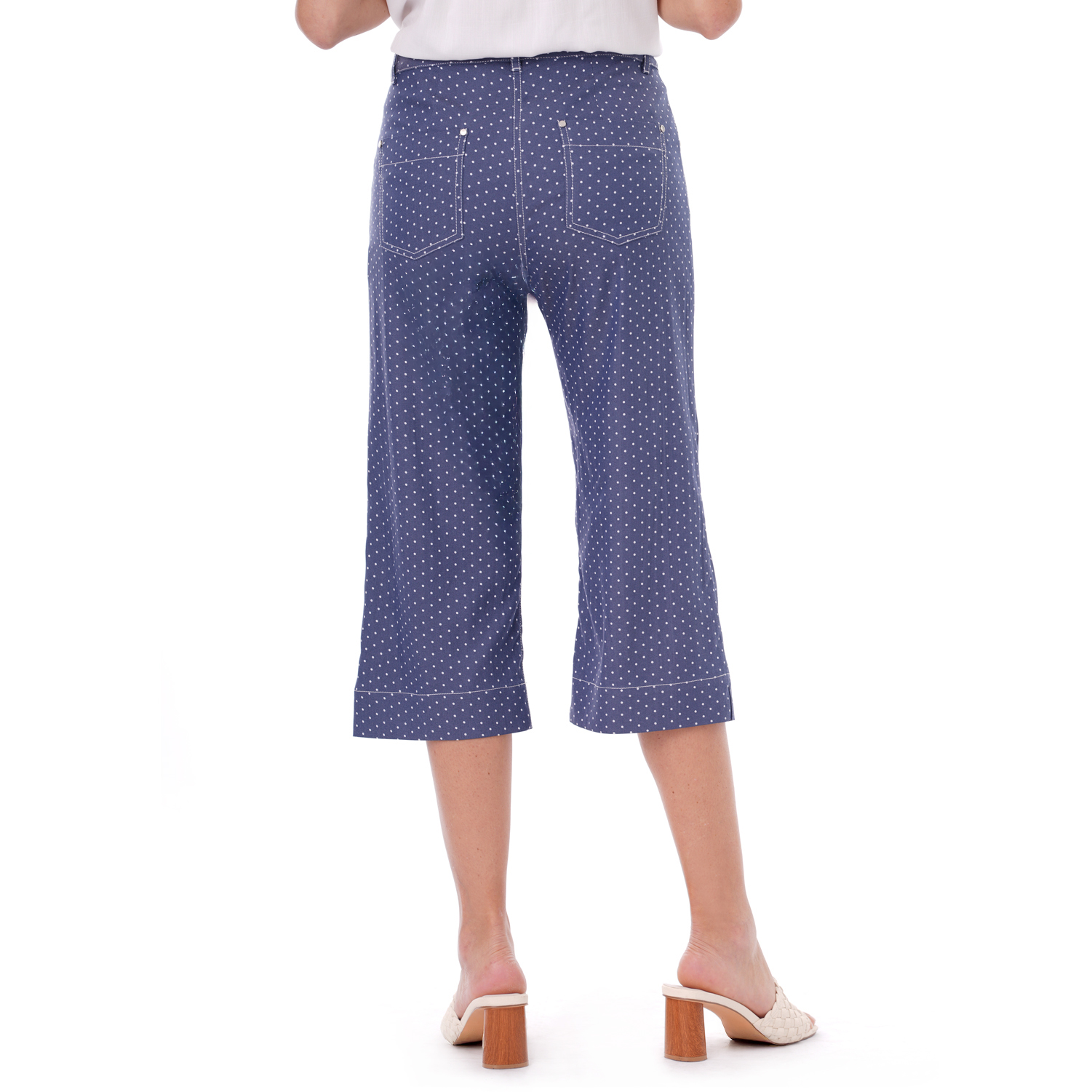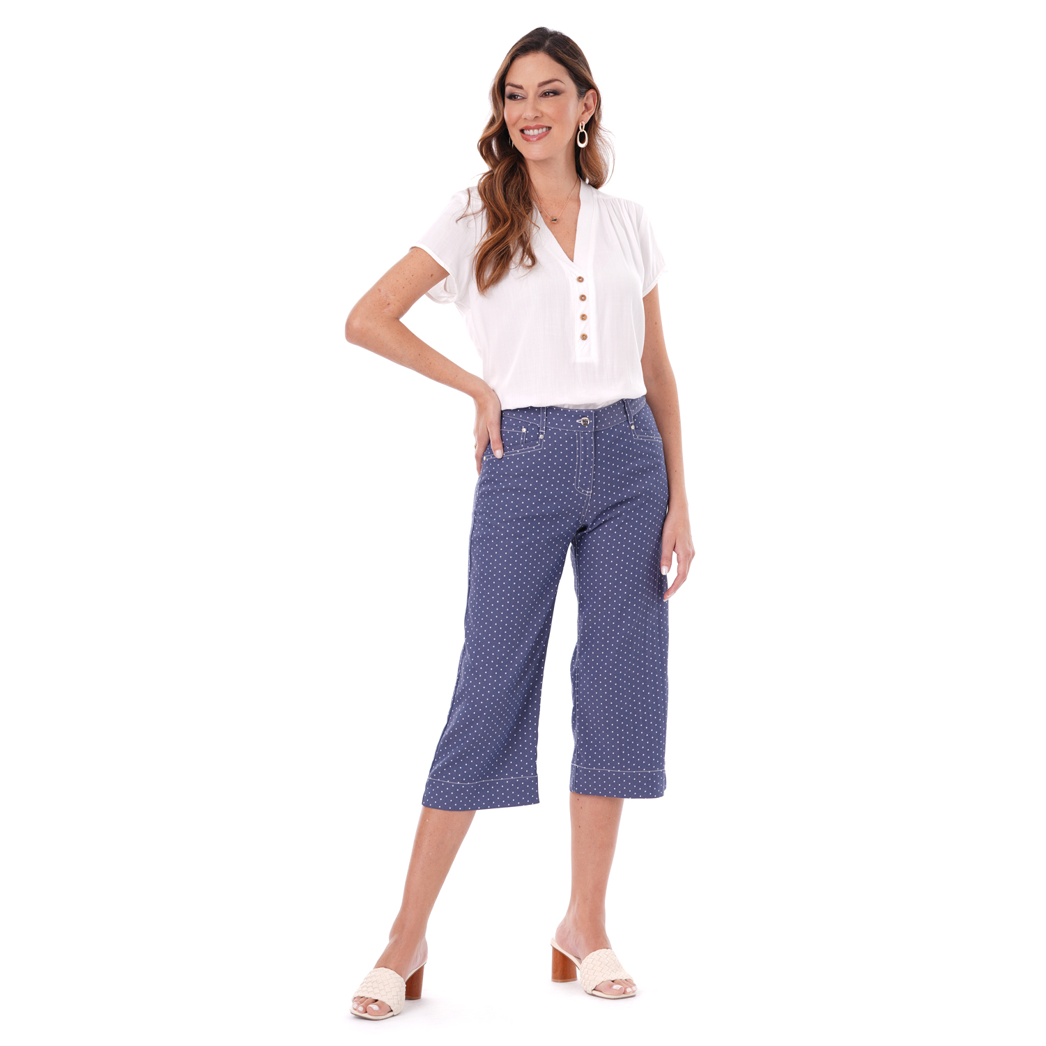 Este capri estampado en denim look presenta un diseño actual y versátil, ideal para crear looks modernos con una silueta definida.