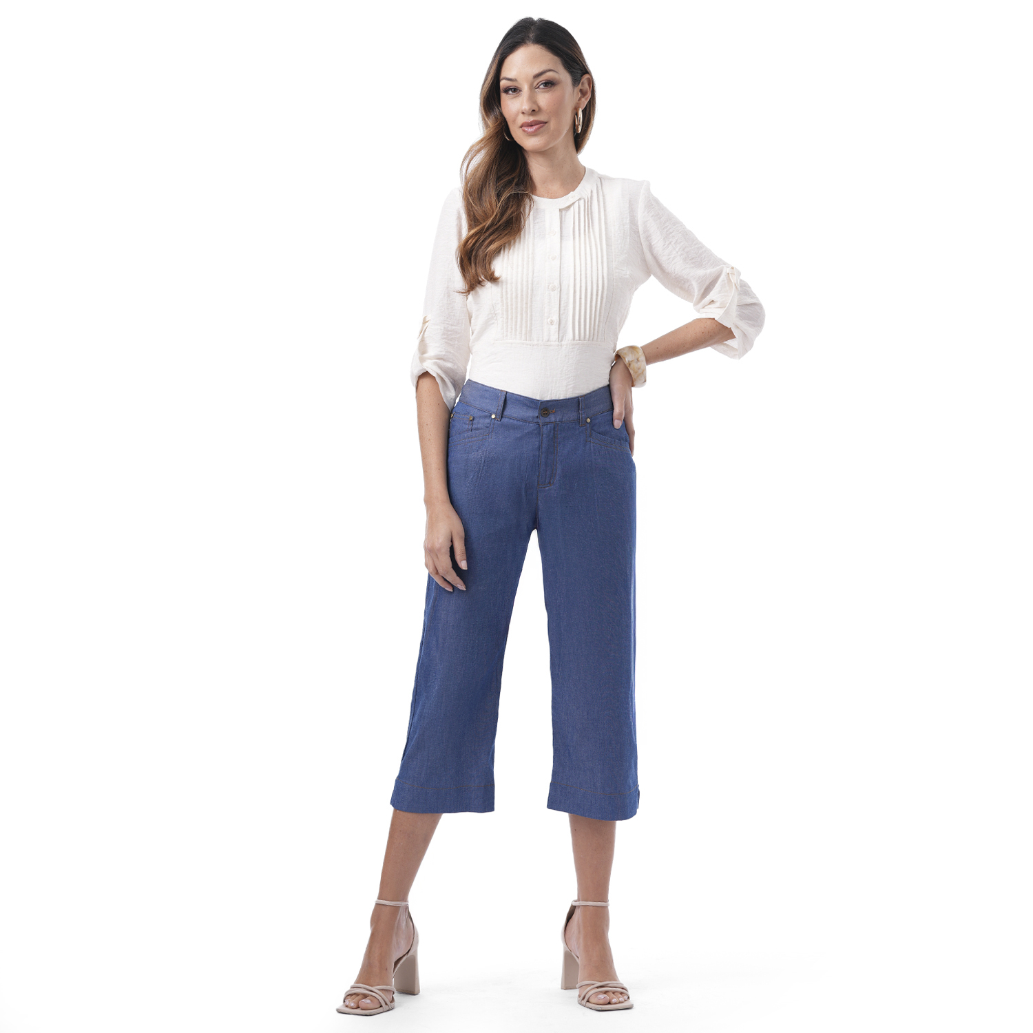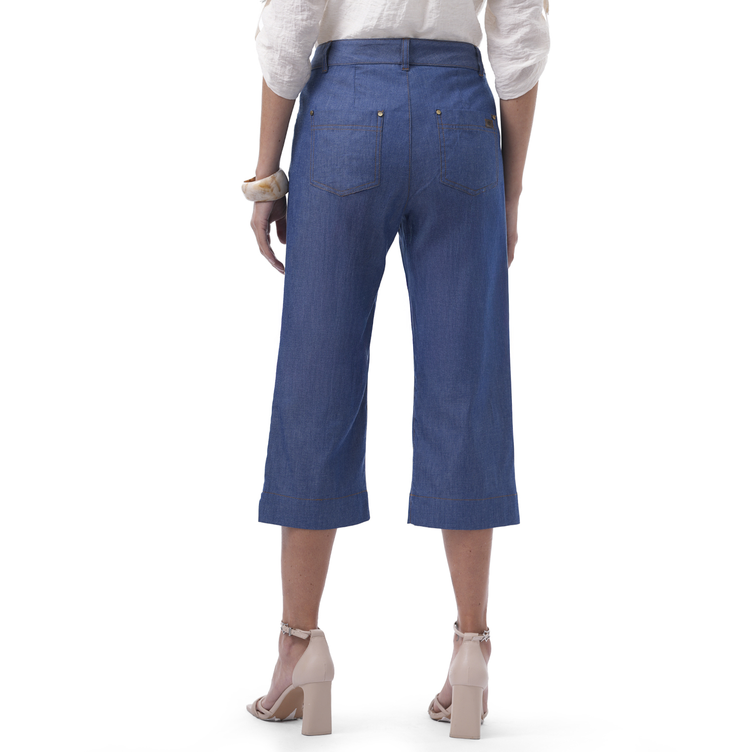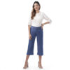 Este capri en denim combina estilo y comodidad en una silueta moderna. Su diseño impecable y acabado versátil lo convierten en una prenda clave para crear looks elegantes con un toque contemporáneo.