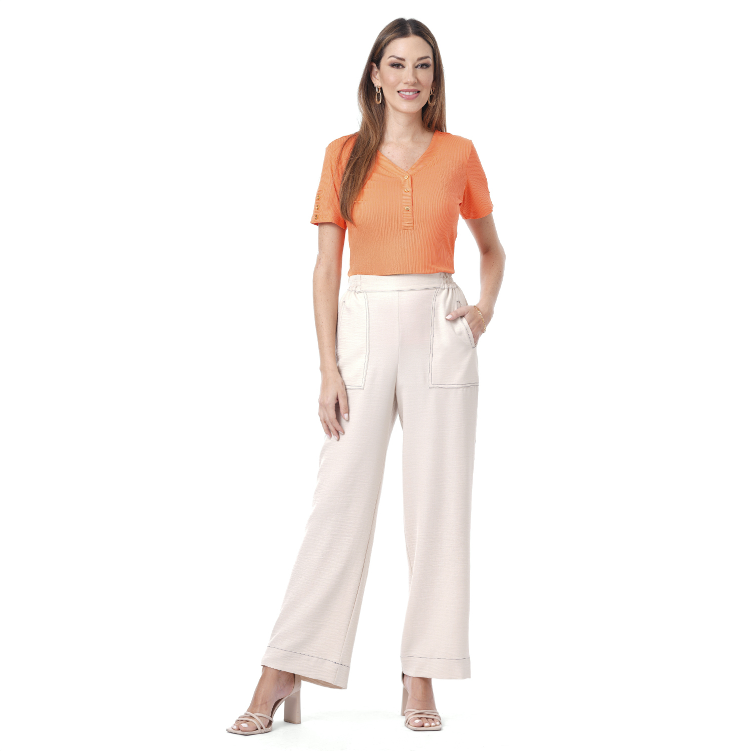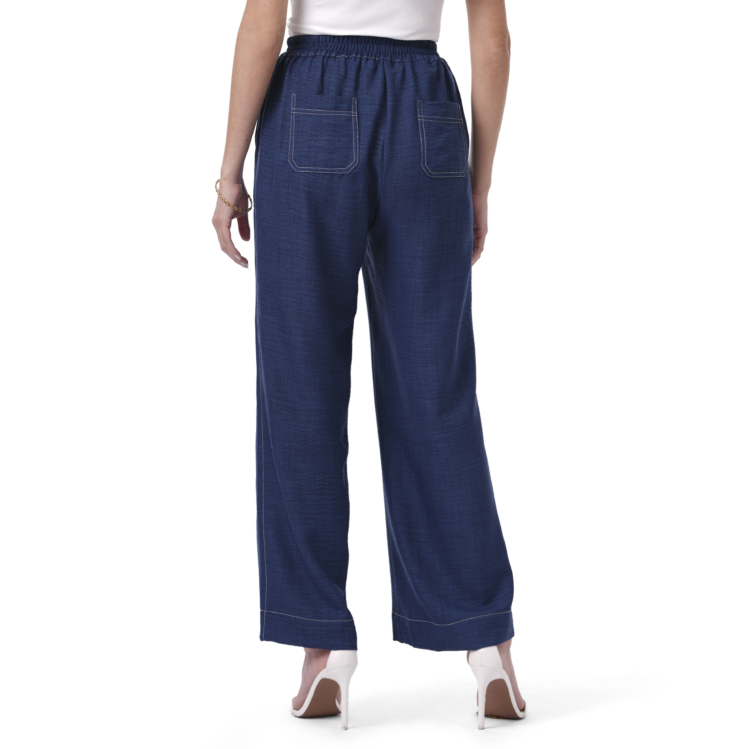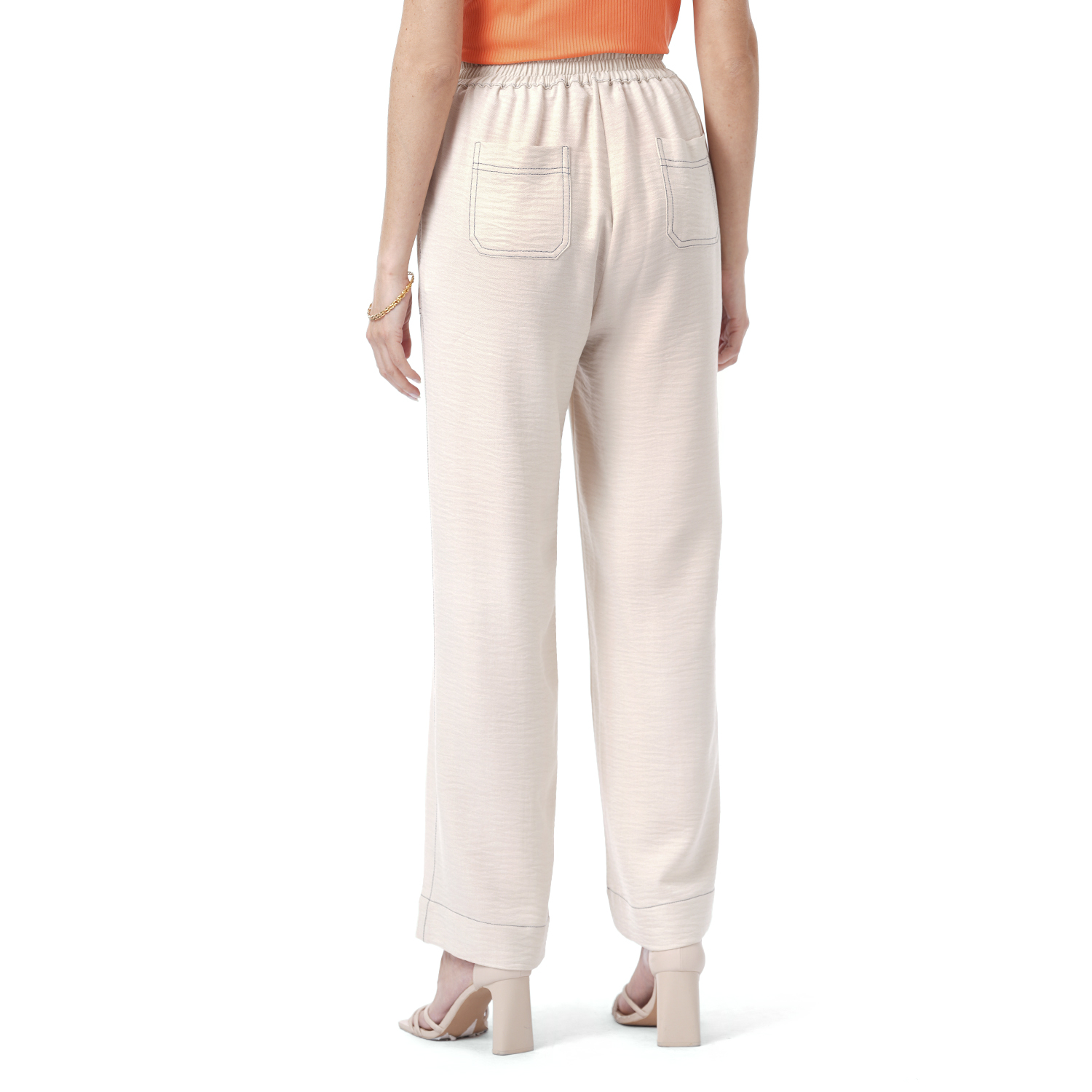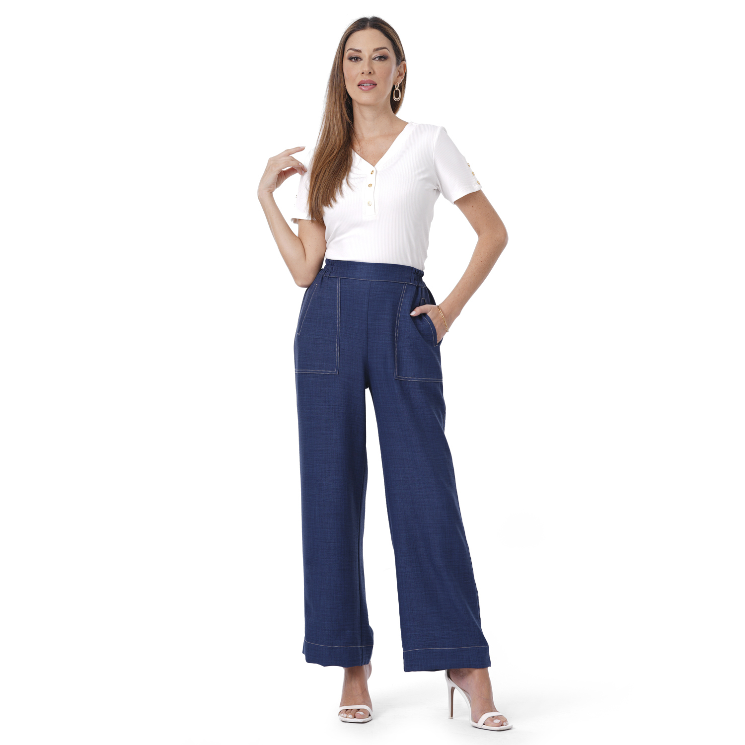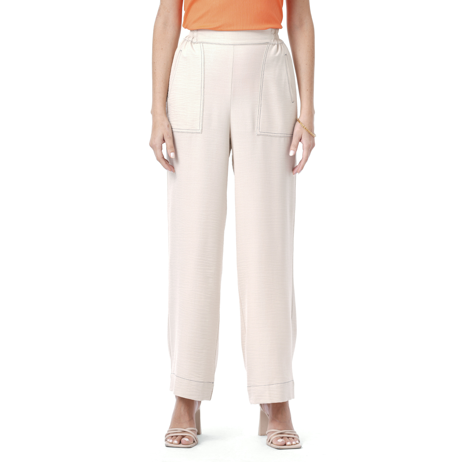 Este pantalón recto y ancho con pespuntes presenta un diseño contemporáneo que aporta carácter y estilo.