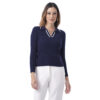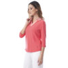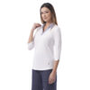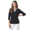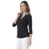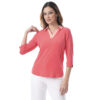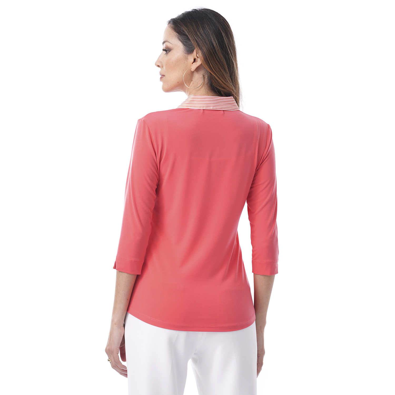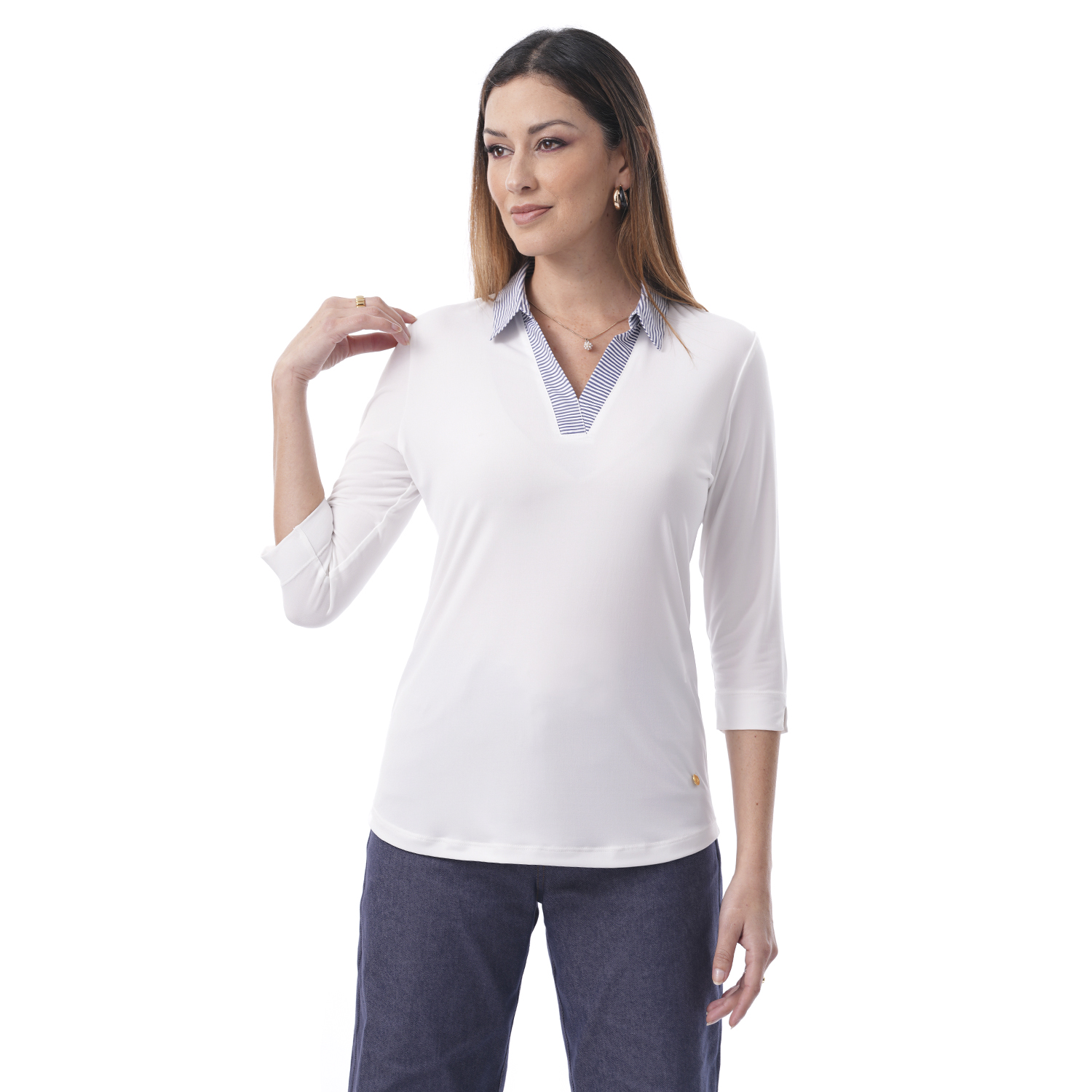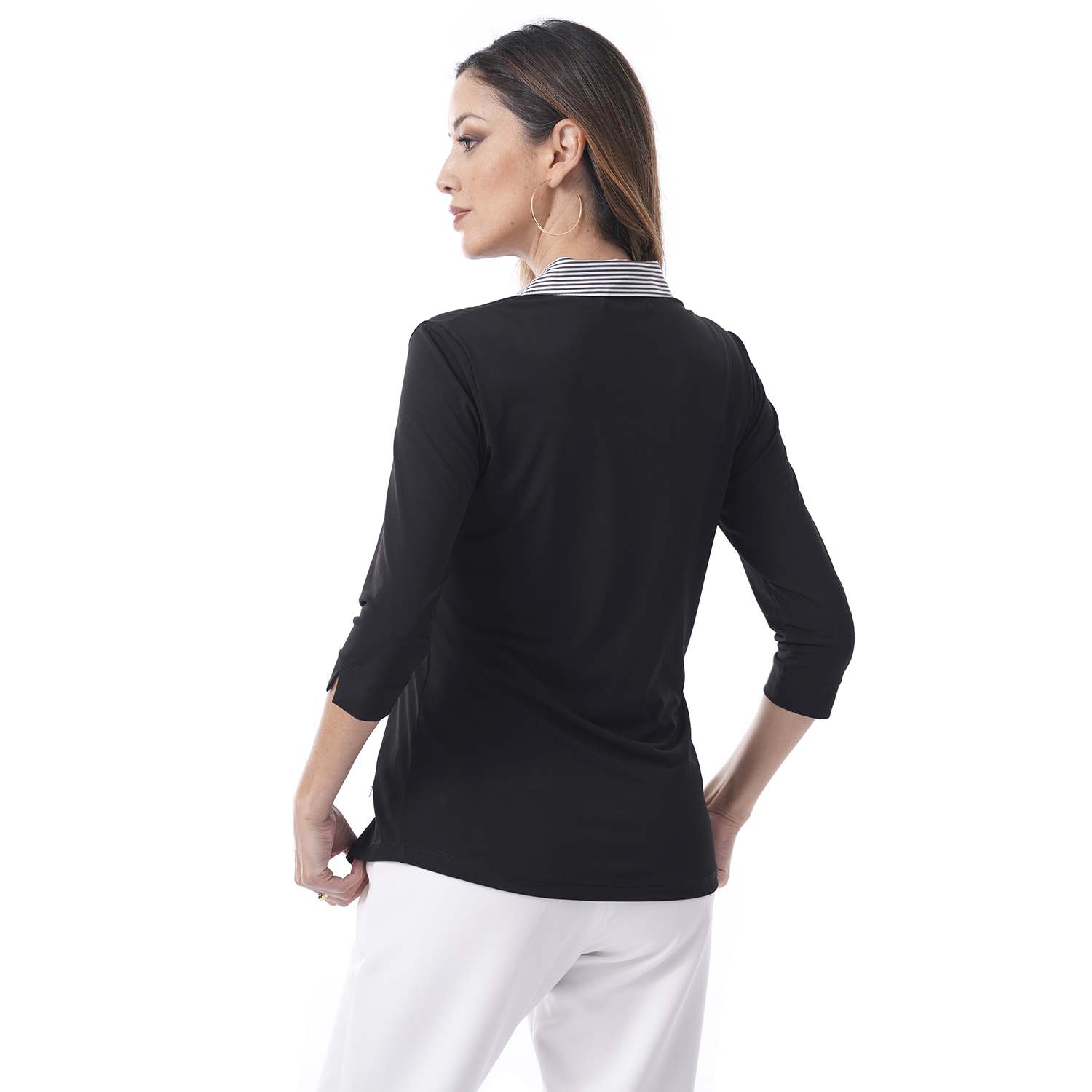 Este polo de manga 3/4 con detalle de rayas en el cuello aporta un toque moderno y sutil a una prenda básica.