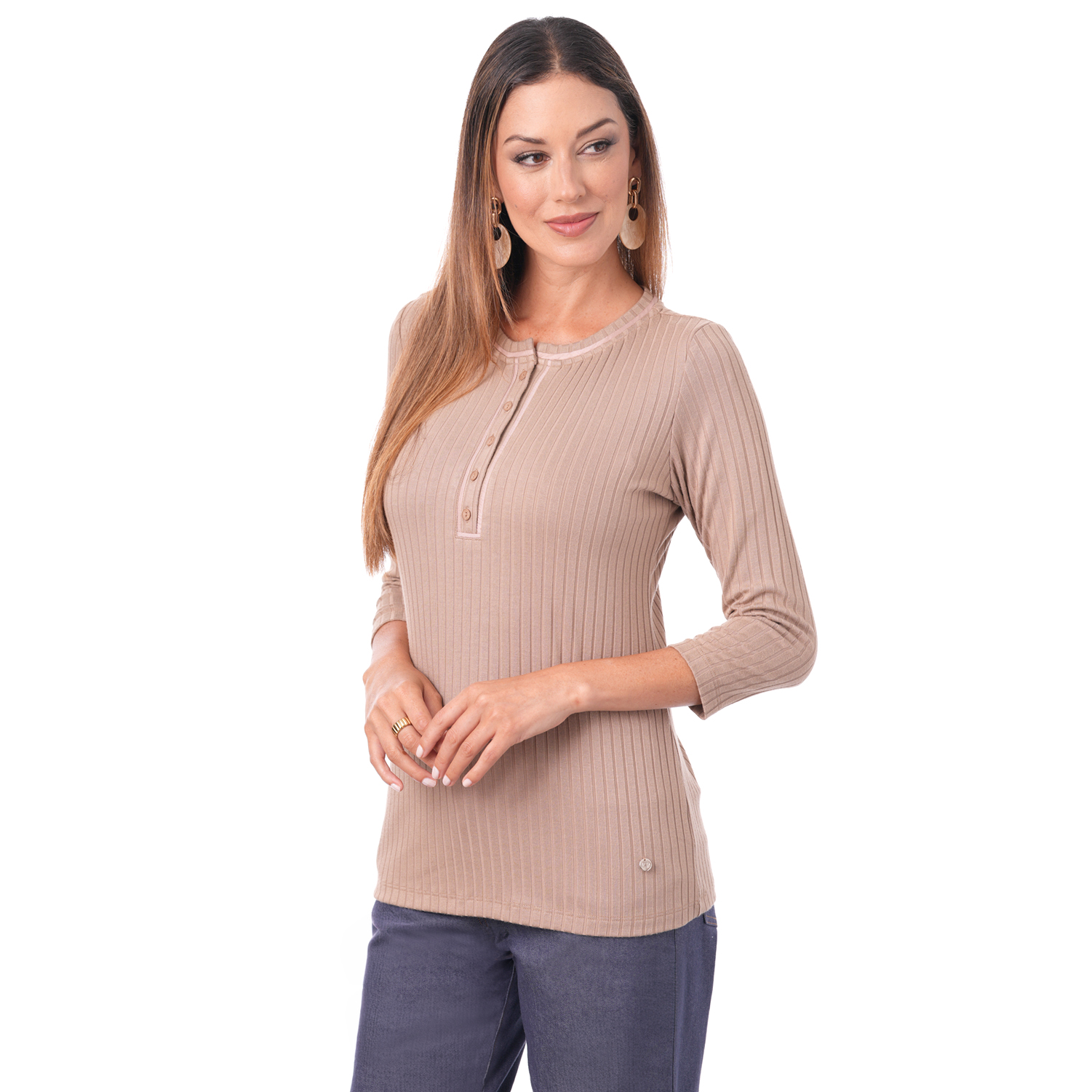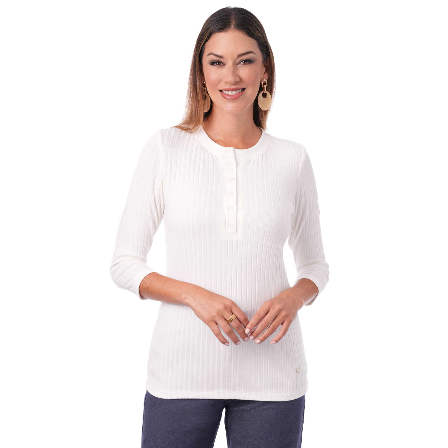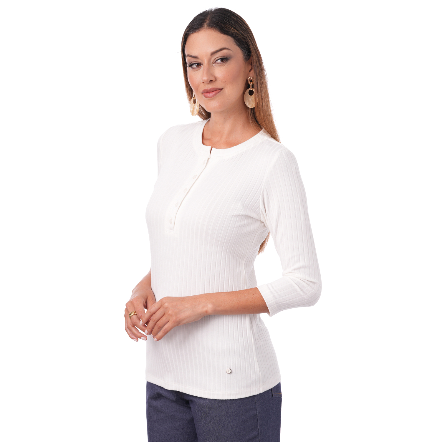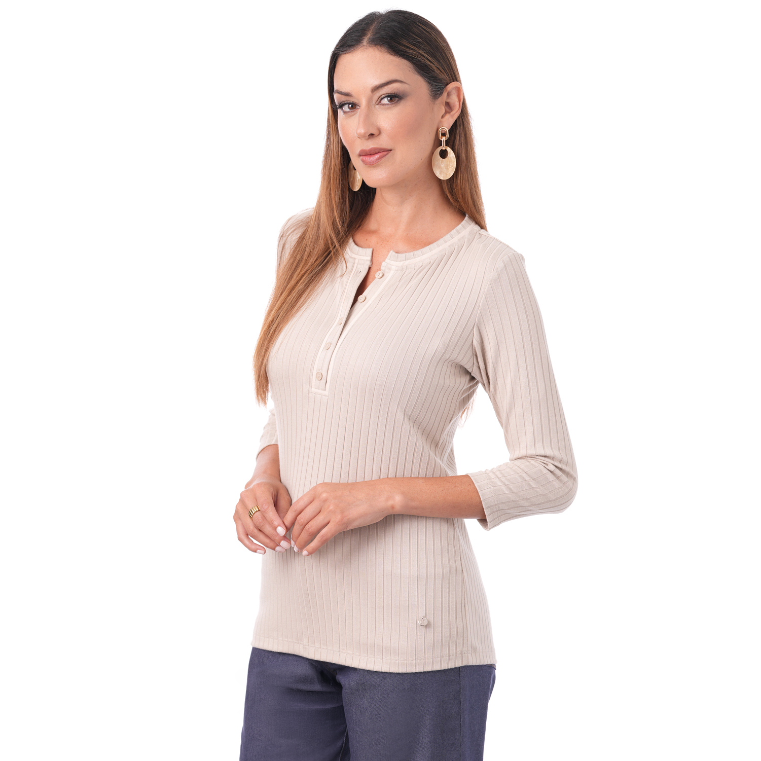 Este polo de color entero y manga 3/4 presenta una silueta sobria y versátil, ideal para un look ordenado y fácil de combinar.