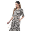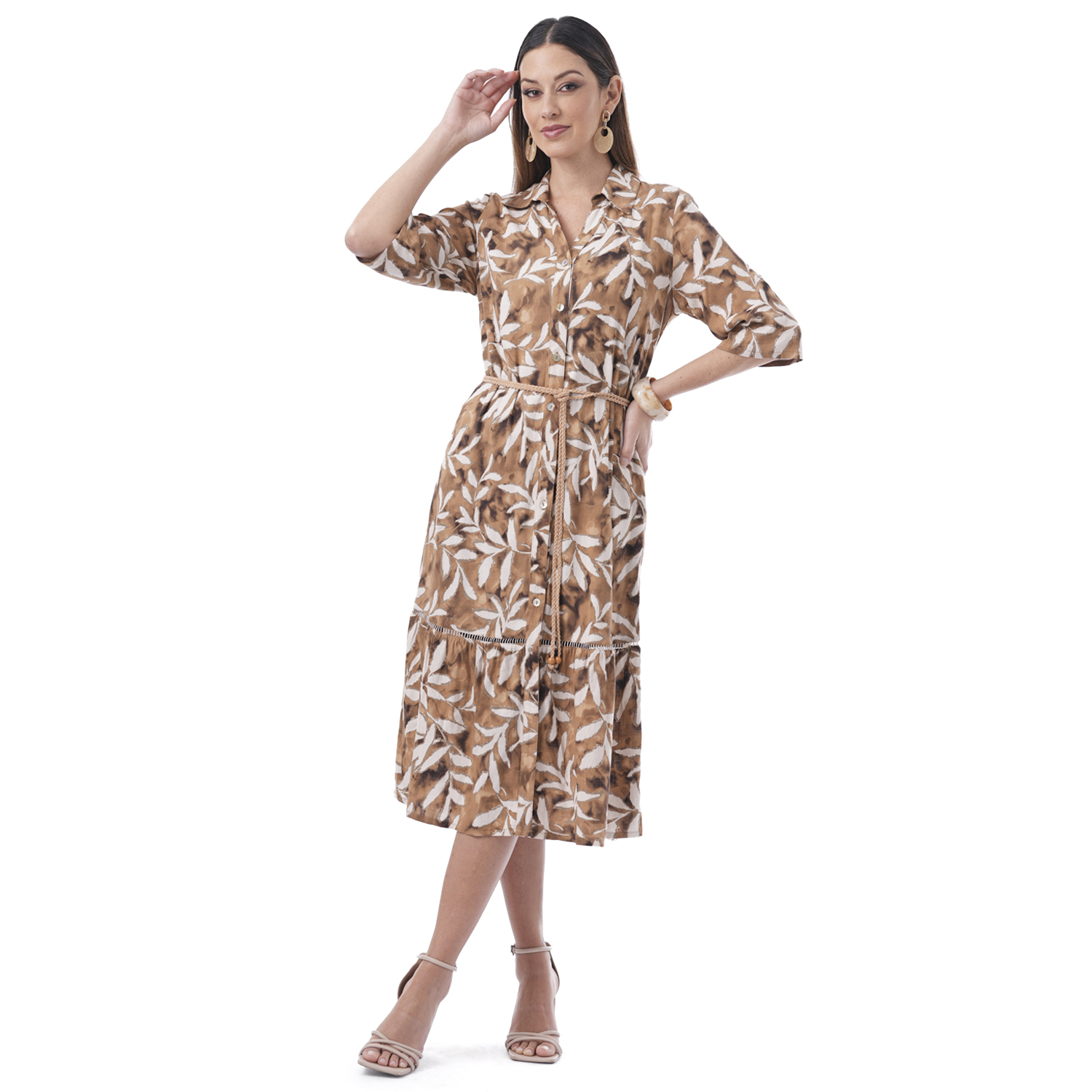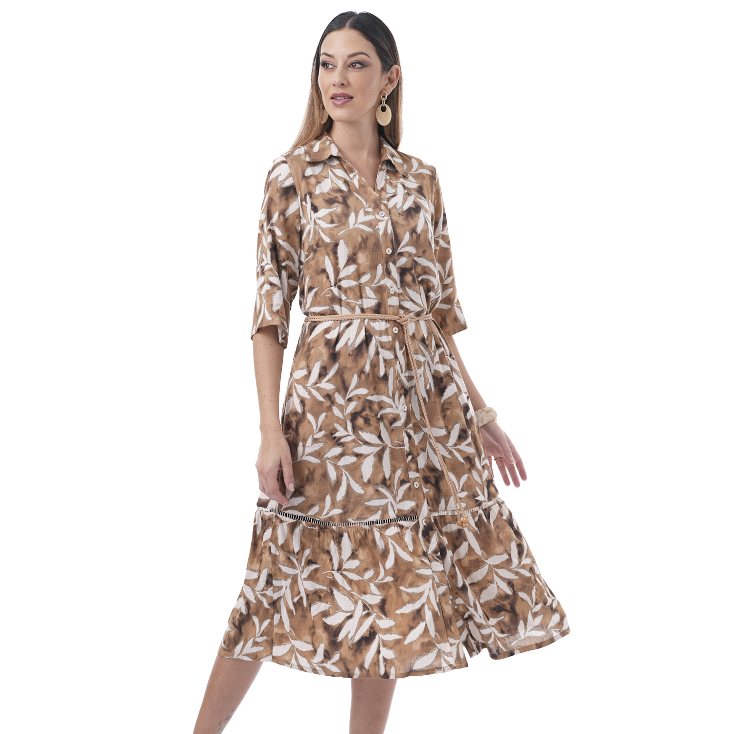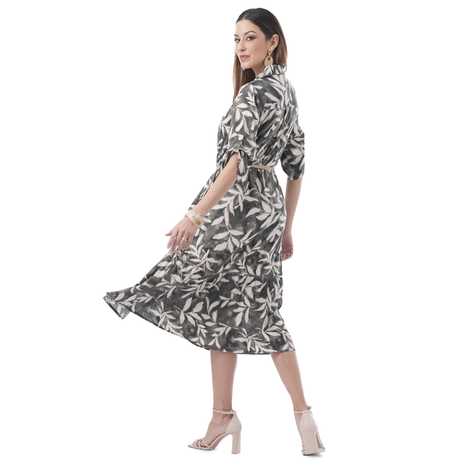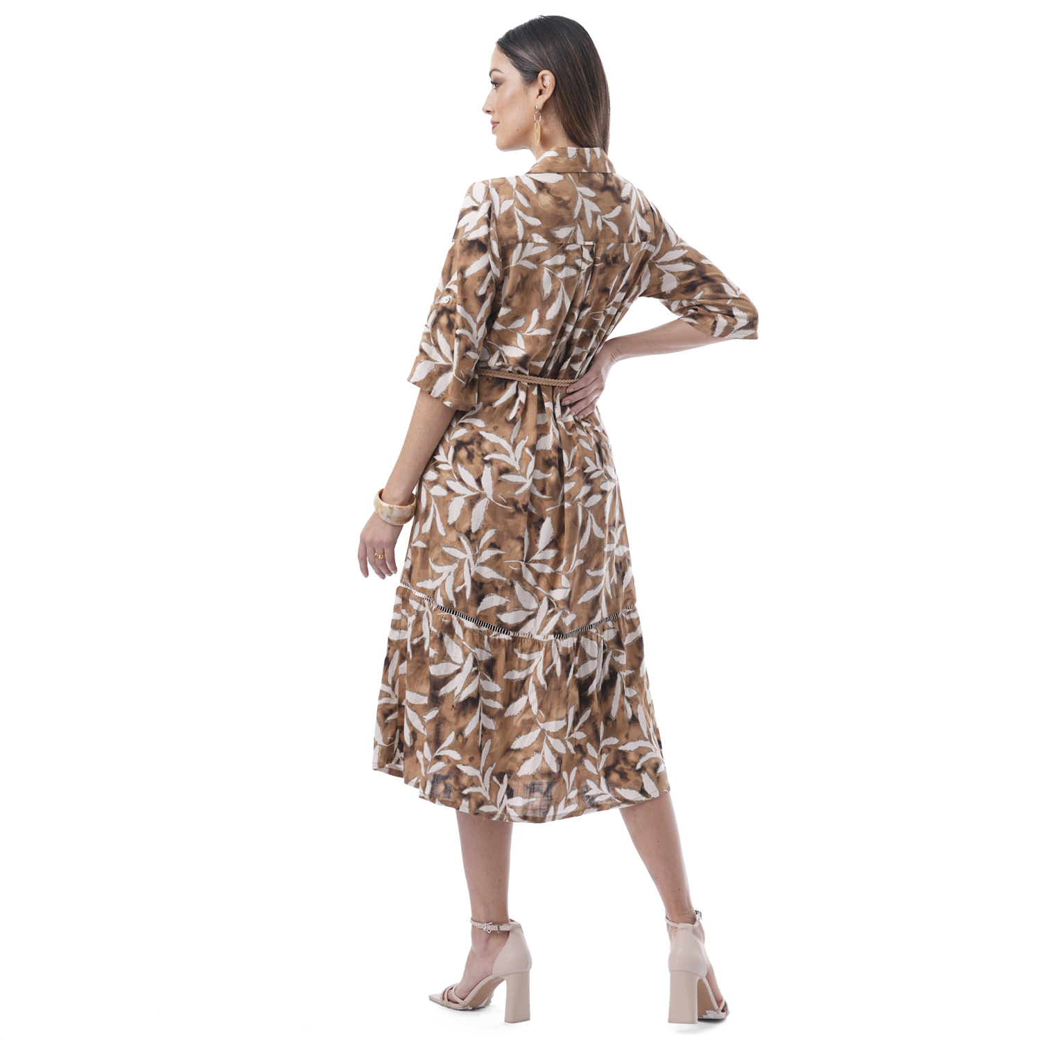 Este vestido largo estampado con cinturón combina elegancia y movimiento en cada detalle. Su diseño estiliza la figura y aporta un aire moderno y sofisticado, ideal para destacar en ocasiones especiales.