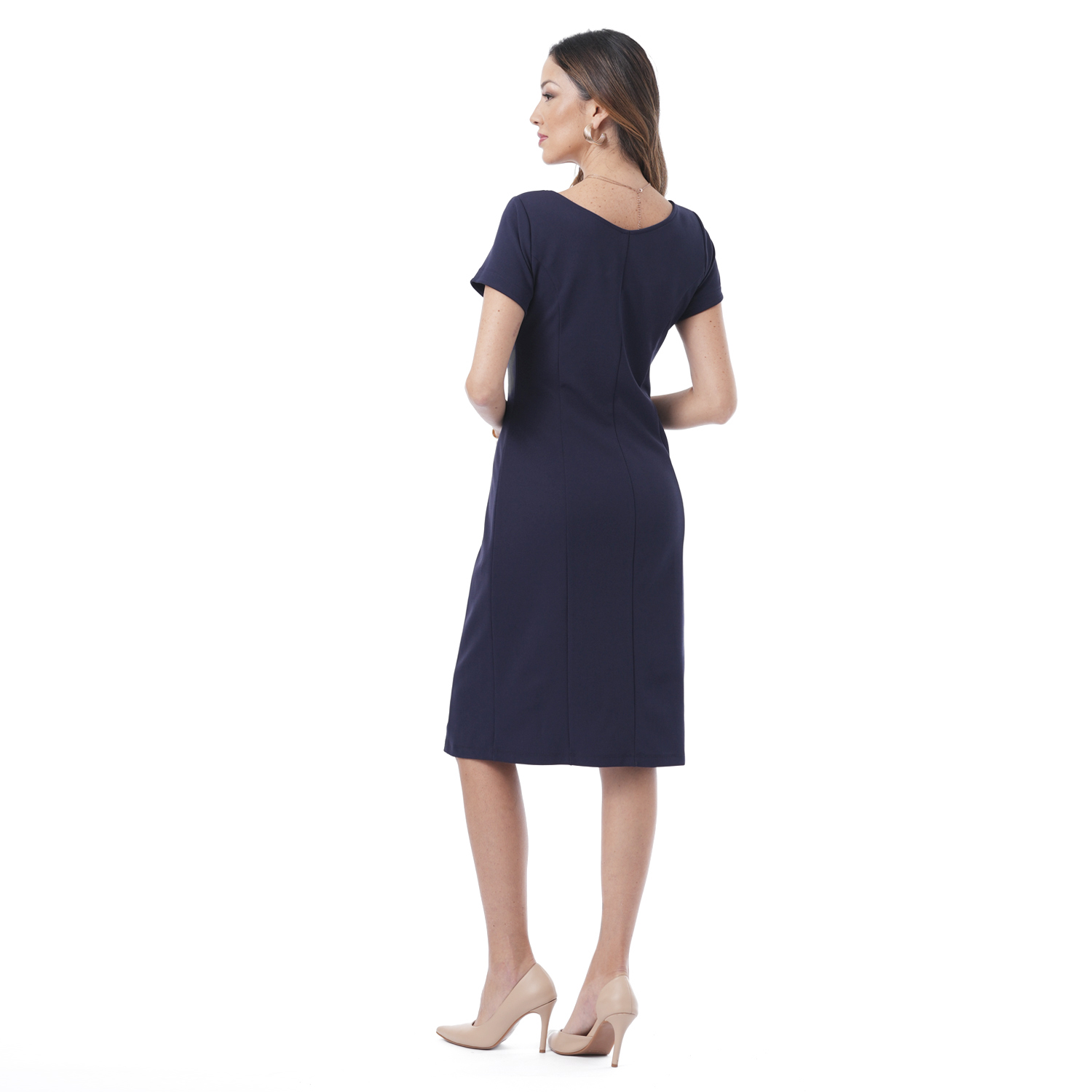 Este vestido de color entero con manga corta y un diseño sofisticado que realza la silueta. Ideal para un look elegante y moderno, perfecto para destacar en cualquier ocasión ejecutiva o casual chic.