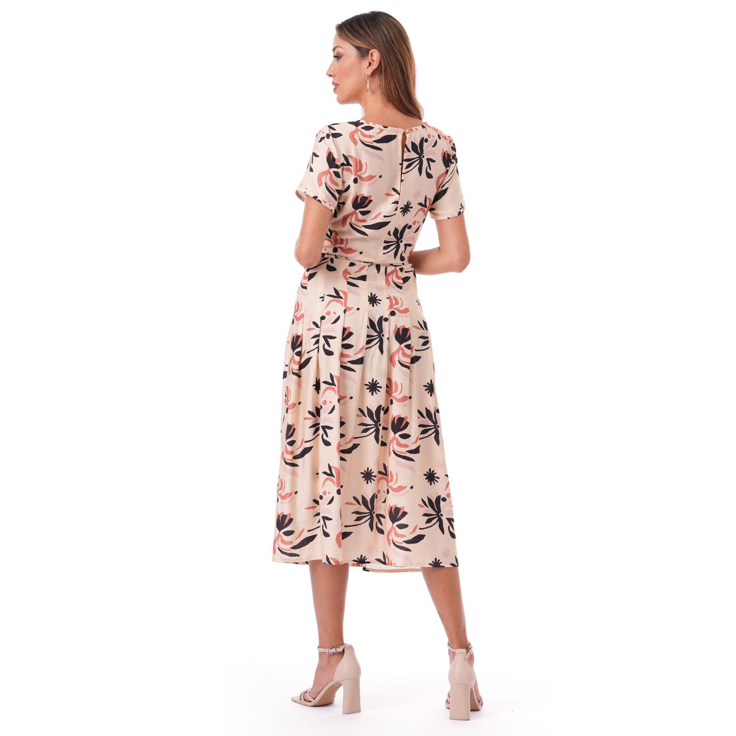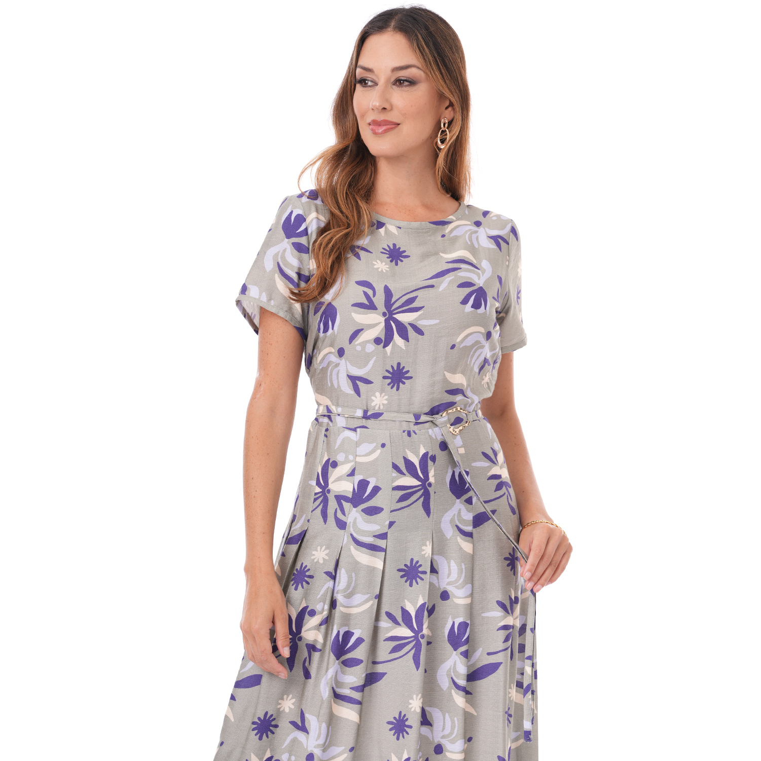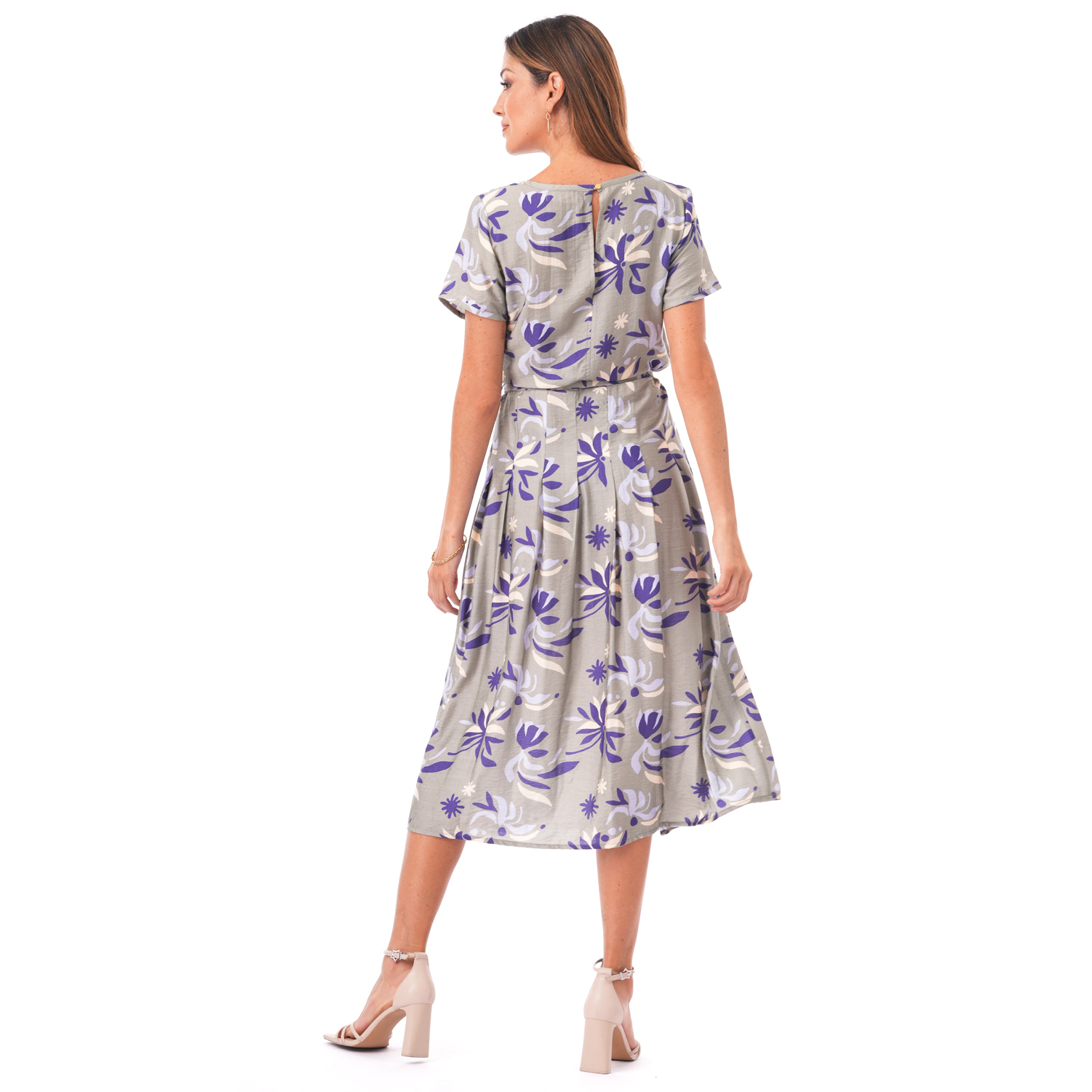 Este vestido manga corta estampado aporta dinamismo y elegancia a la silueta.