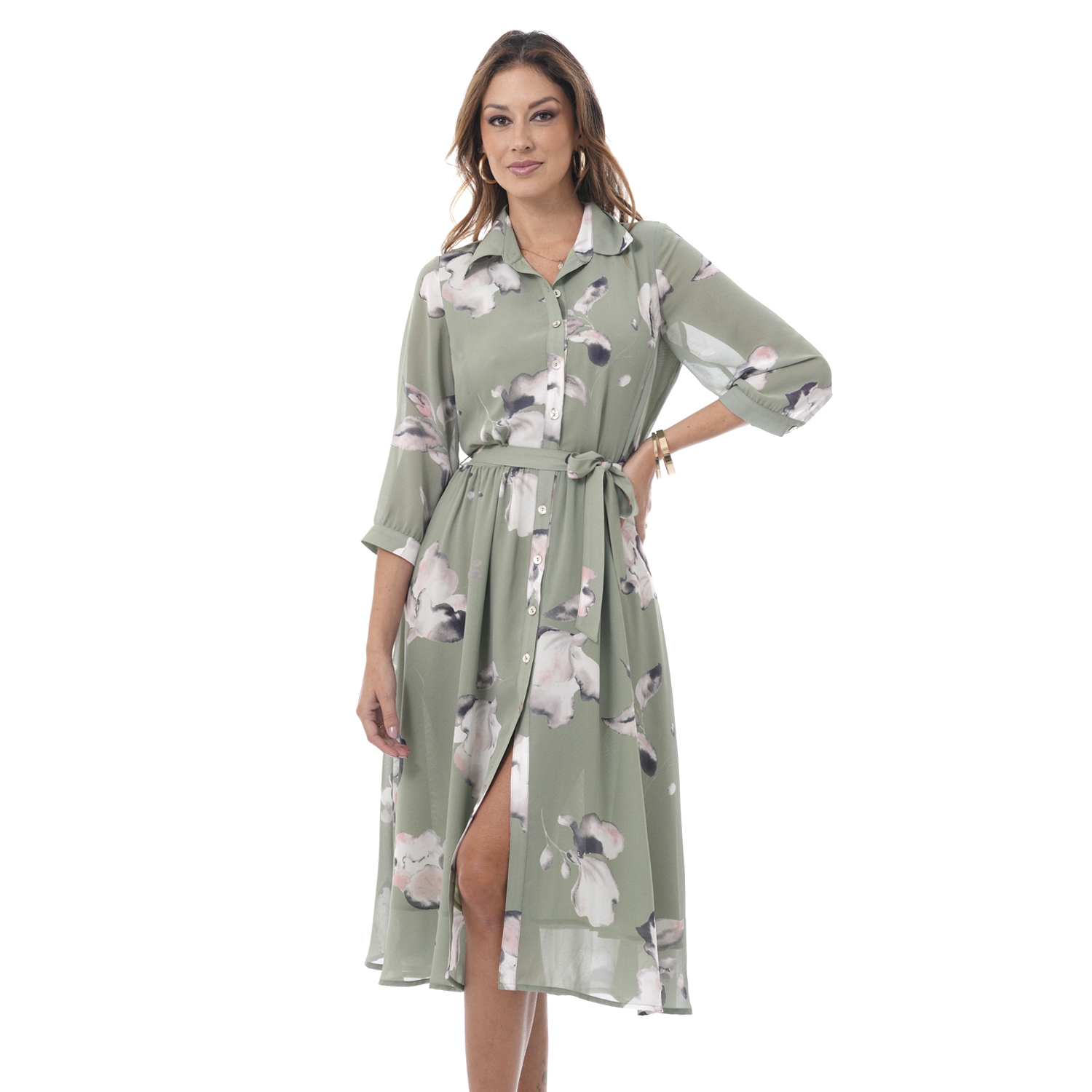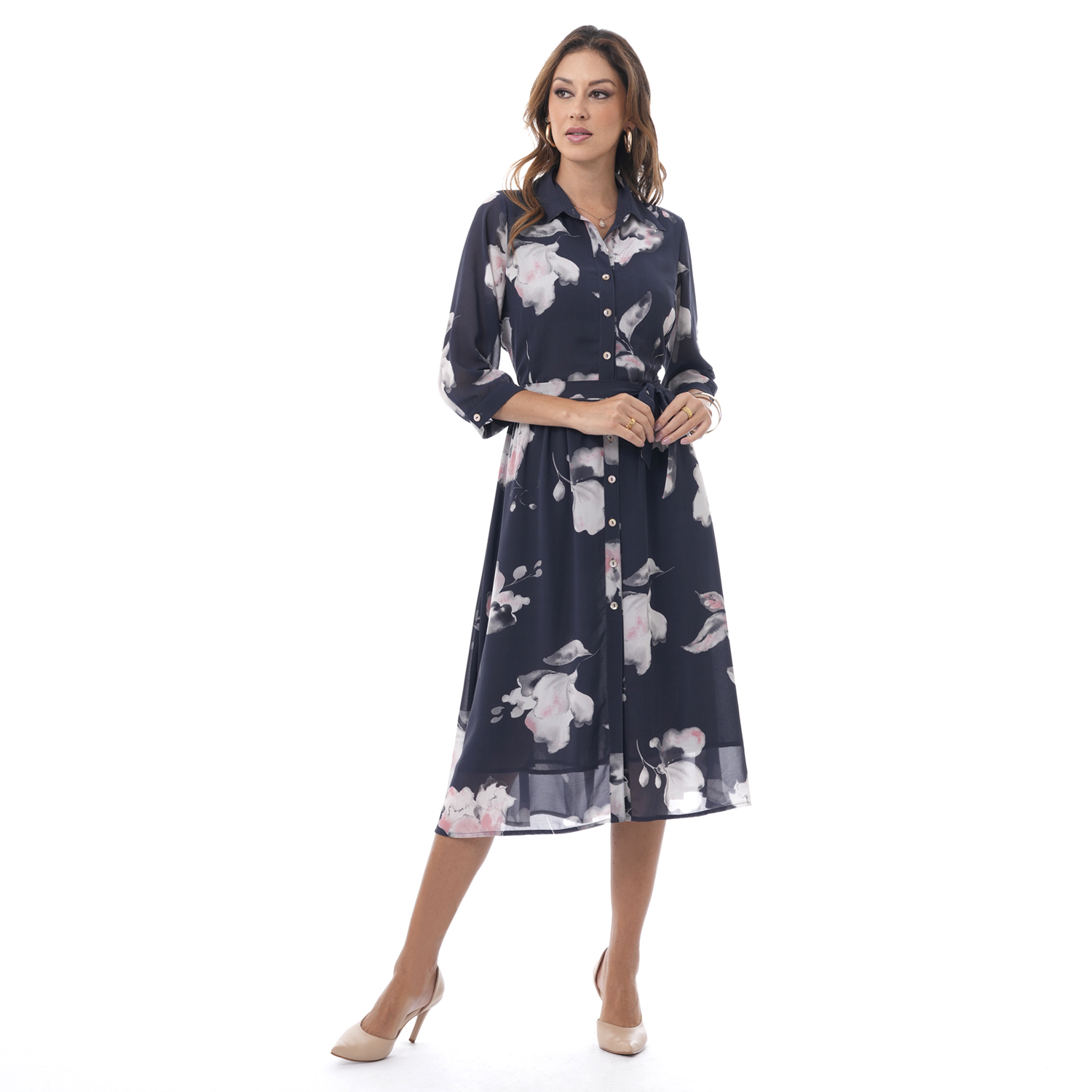 Este vestido camisero estampado destaca por su diseño clásico y versátil, con mangas 3/4 que aportan comodidad y estilo.